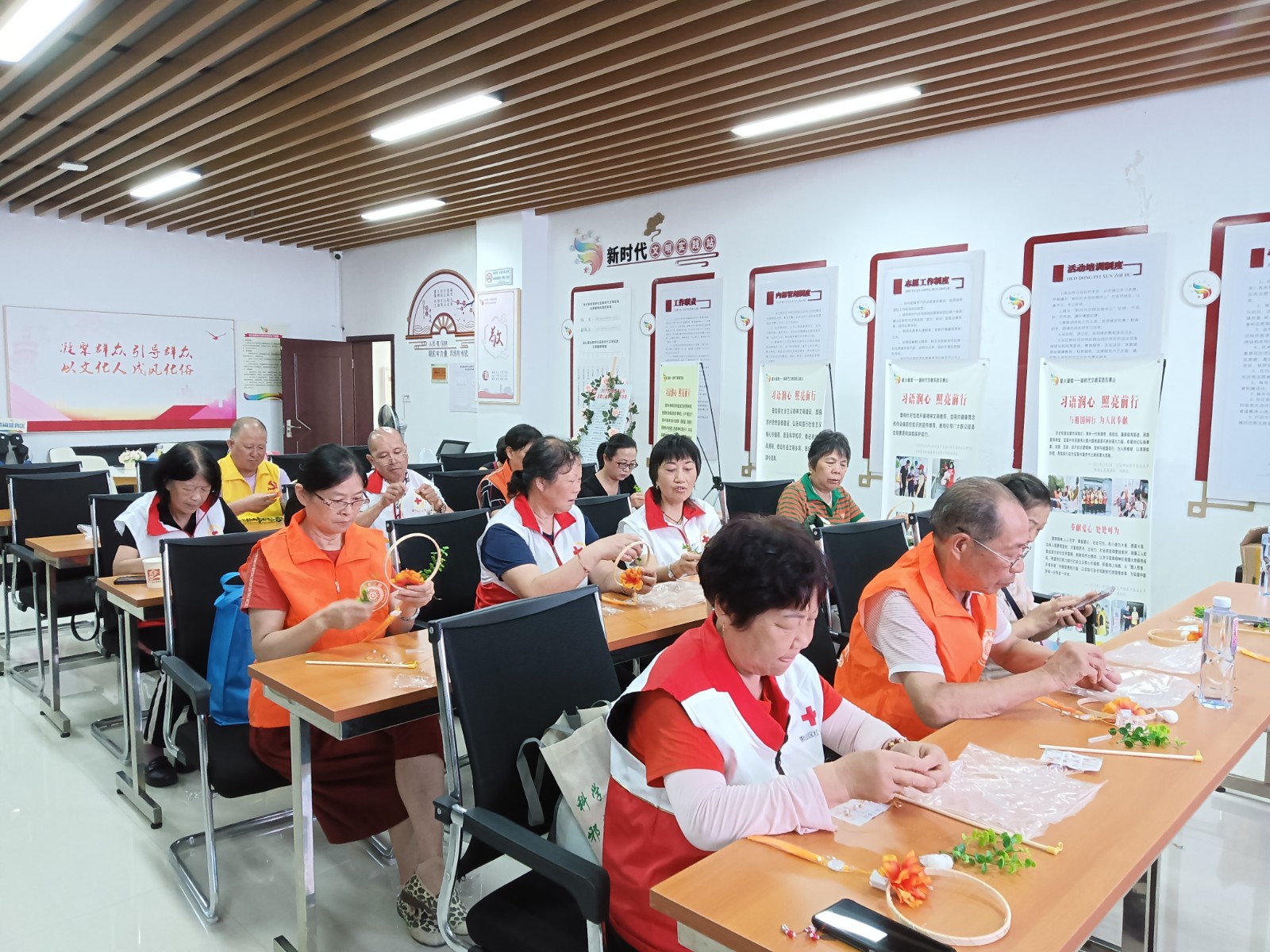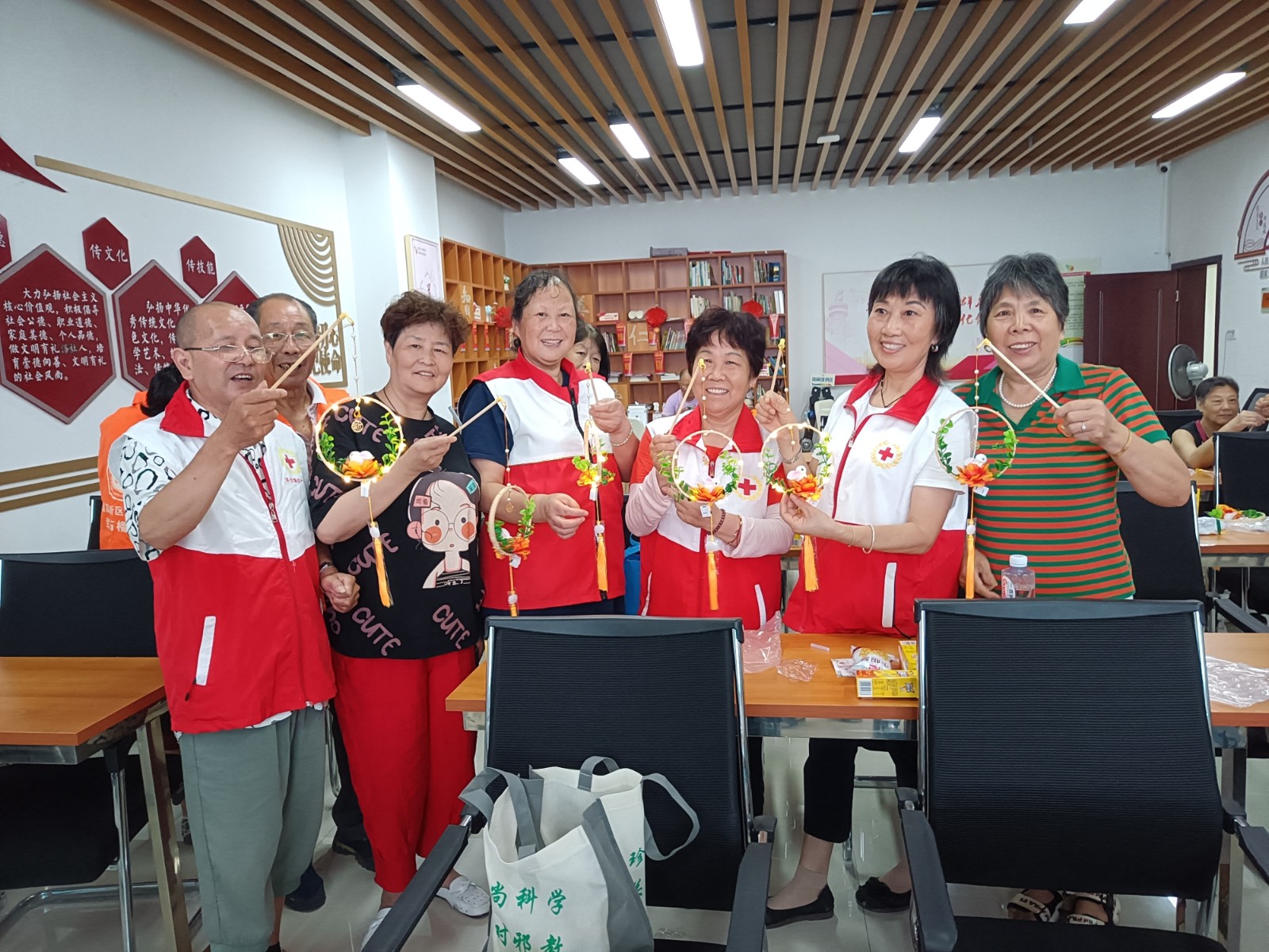活动中,每个人脸上都露出幸福的笑容,留下幸福合影。红十字志愿老师们耐心地指导大家,用好材料包素材,将花枝、玩偶、线圈等,按照说明书,逐个贴到花环上。“这个花灯制作起来很方便,按照自己的意愿喜好制作,成品很漂亮!”居民朱阿姨开心的说道。