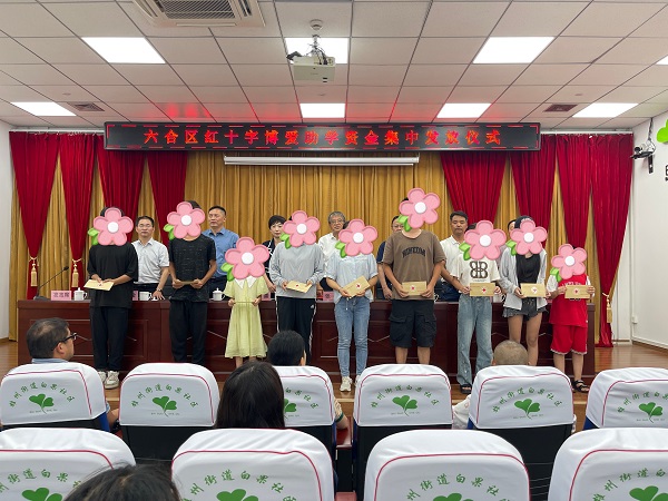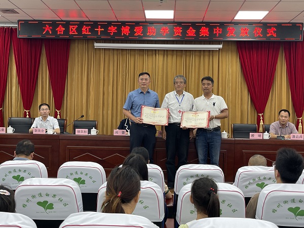 在新的学年即将开始之际,为关爱贫困学生,8月31日下午,六合区红十字会在雄州街道白果社区举办红十字博爱助学资金集中发放仪式,共资助42名困难家庭的学生,资助金额近10万元。区红十字会常务副会长张弛、区教育局卫保所所长耿克金、爱心企业家代表,以及各街镇红十字会秘书长和受资助学生代表共40余人参加了本次发放仪式。
