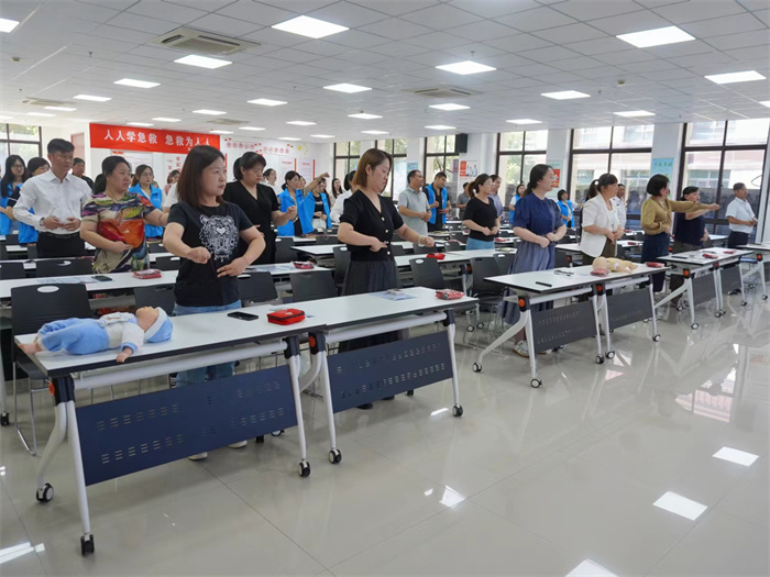在毓龙街道海纯社区开展的 “应急救护培训进社区”活动,为30名社区群众提供应急救护培训。为了让大家清晰深刻的学习到急救护知识,现场学员在讲师指导下进行CPR实操练习。