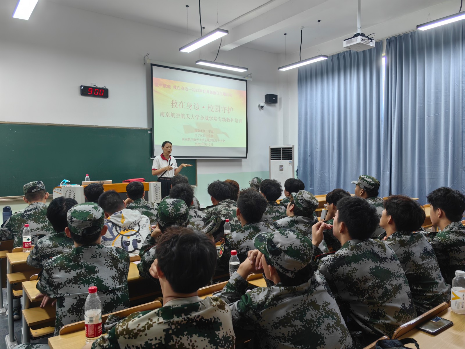 关爱生命,救在身边。9月1日-2日,南航金城学院第二届全覆盖军训应急救护培训工作正式开始,4521名大一新生参加CPR+AED培训。截止目前,南航金城学院拥有应急救护基本技能师生超过万人目标,覆盖全体学工人员、体育教师、实验员、后勤保卫人员、宿管员、志愿者骨干。