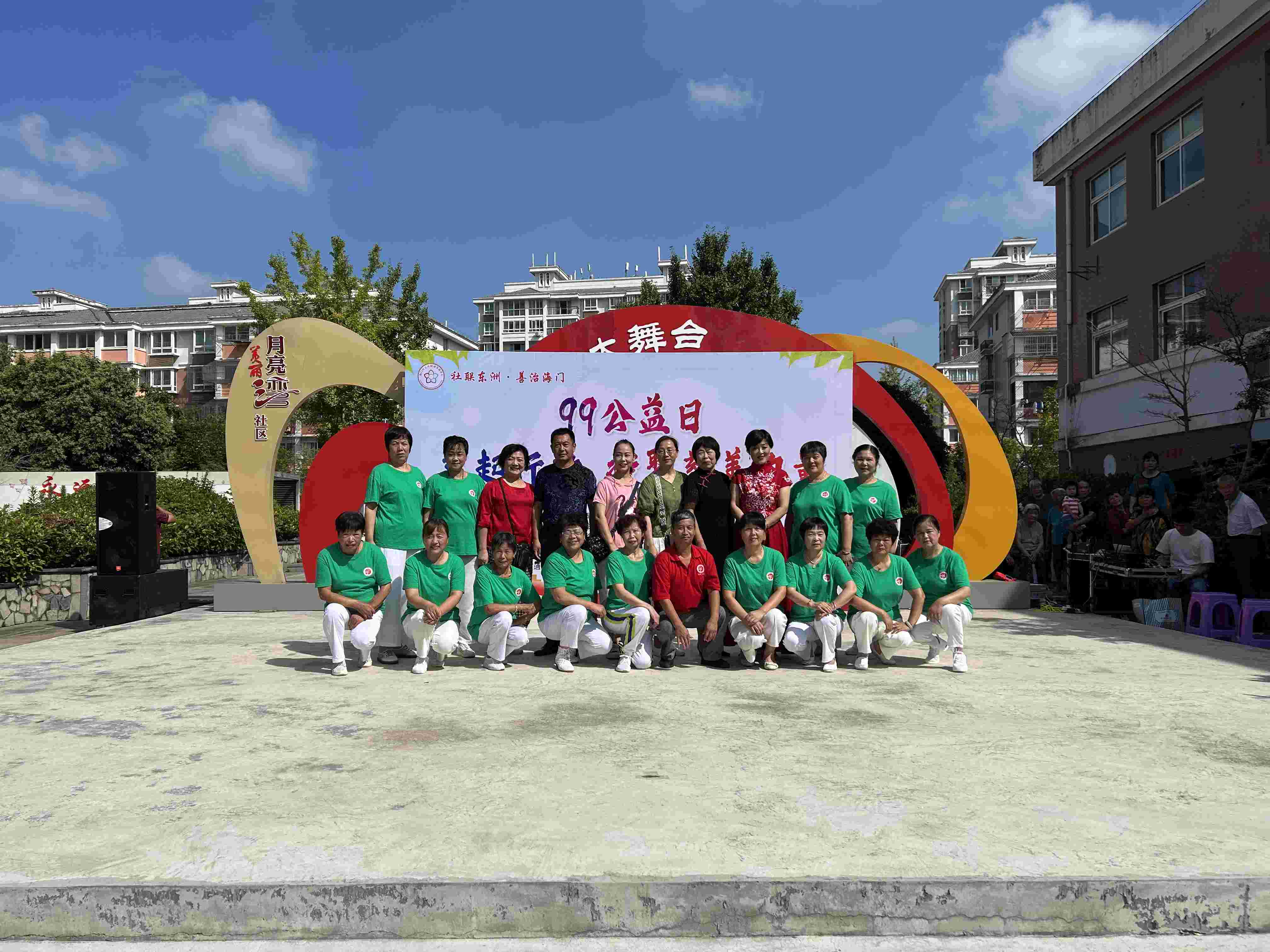 九九公益 文艺汇演。文艺汇演节目由月亮湾小区健身队和老体协公益组织联合表演,在舞蹈“花球舞爱我中华”拉开活动帷幕,接着,小品、歌曲、舞蹈等一系列精彩节目轮番上演。台上演员们精神饱满,热情洋溢,台下居民听得入神,看得喜悦,笑声连连。整场演出节目内容丰富、精彩纷呈,传递着满满的正能量,表演者们精湛的演出,赢得了现场观众的阵阵掌声。