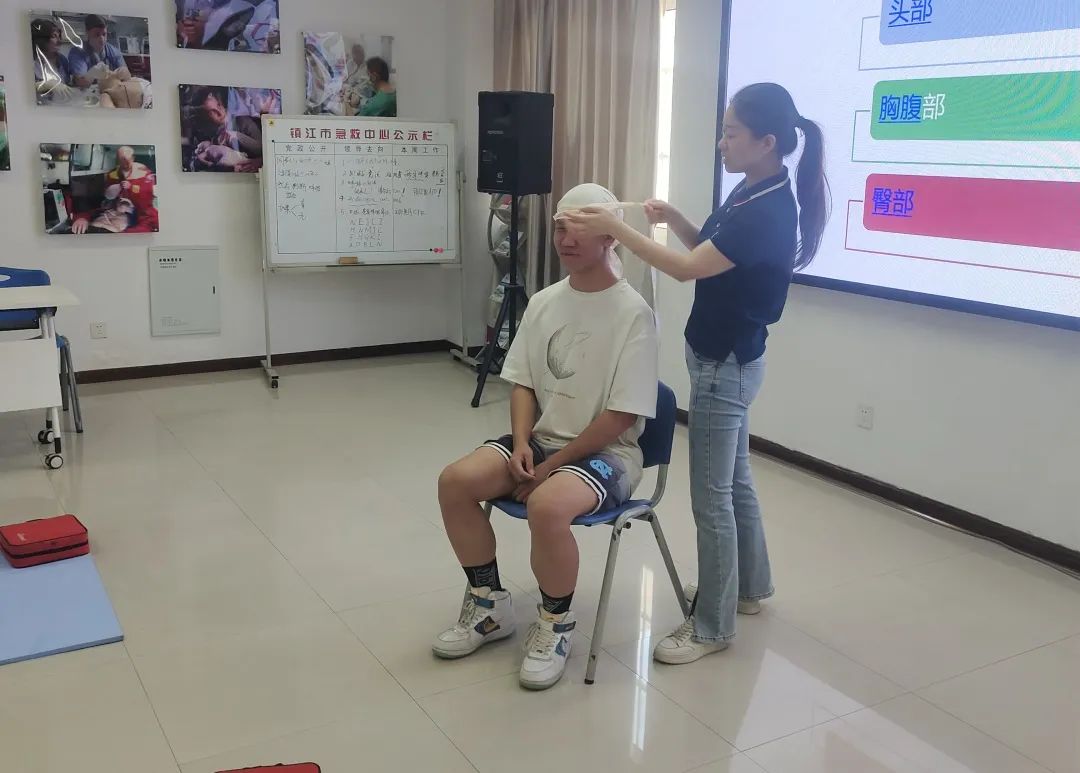 在创伤急救课堂上,培训导师详细讲解了创伤的四大技术——止血、包扎、固定、搬运,并教授了止血带、三角巾、绷带的使用方法。对各种类型的创伤,妥善的急救处理能为后续的治疗奠定良好的基础,预防或减轻并发症,提高患者的治愈率。