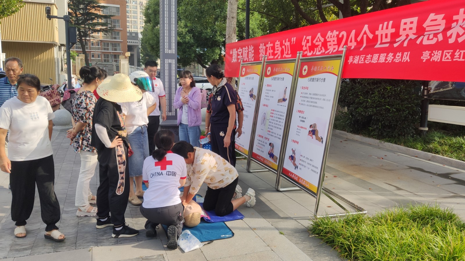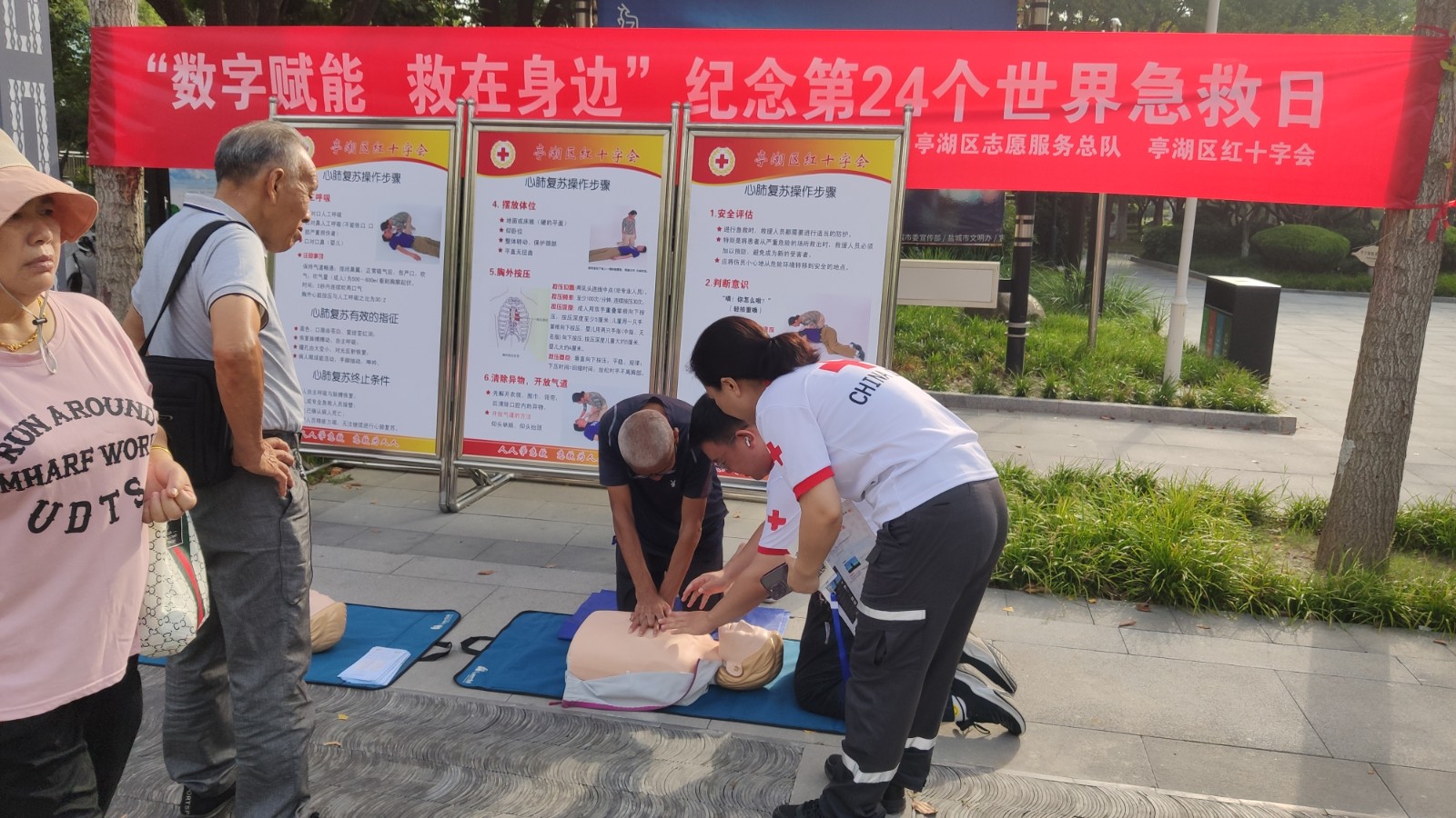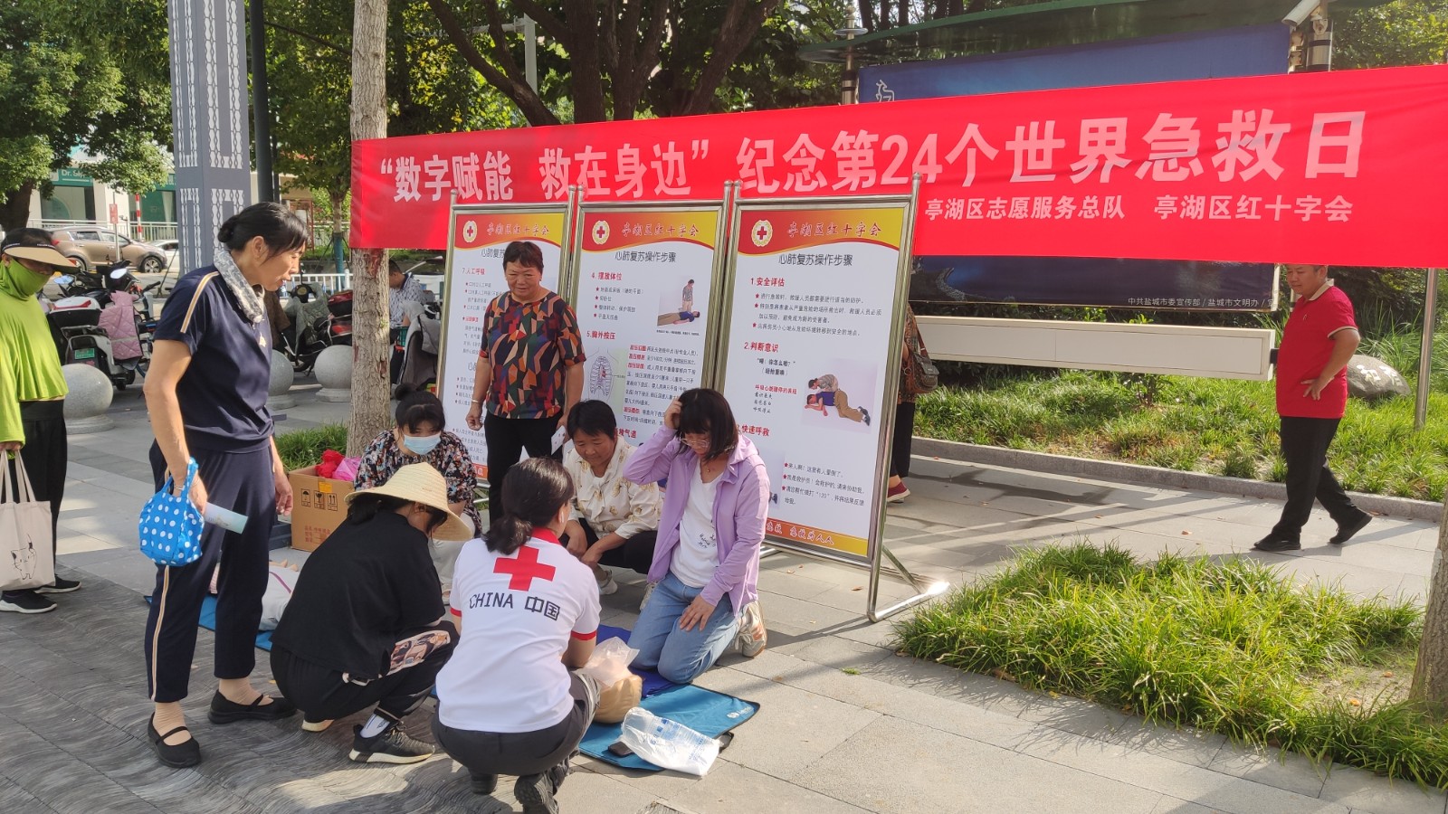 在第24个“世界急救日”到来之际,亭湖区志愿服务总队、亭湖区红十字会在市区迎宾公园举办“数字赋能 救在身边”主题宣传活动,普及应急救护知识和技能。