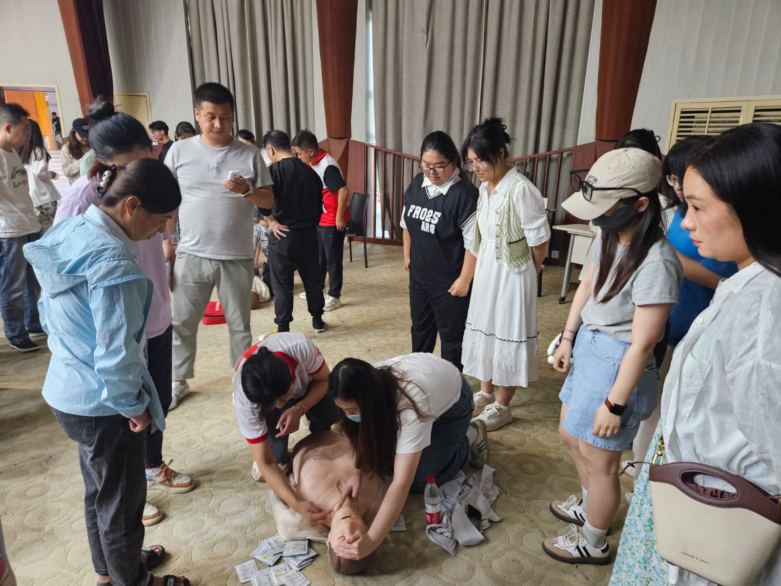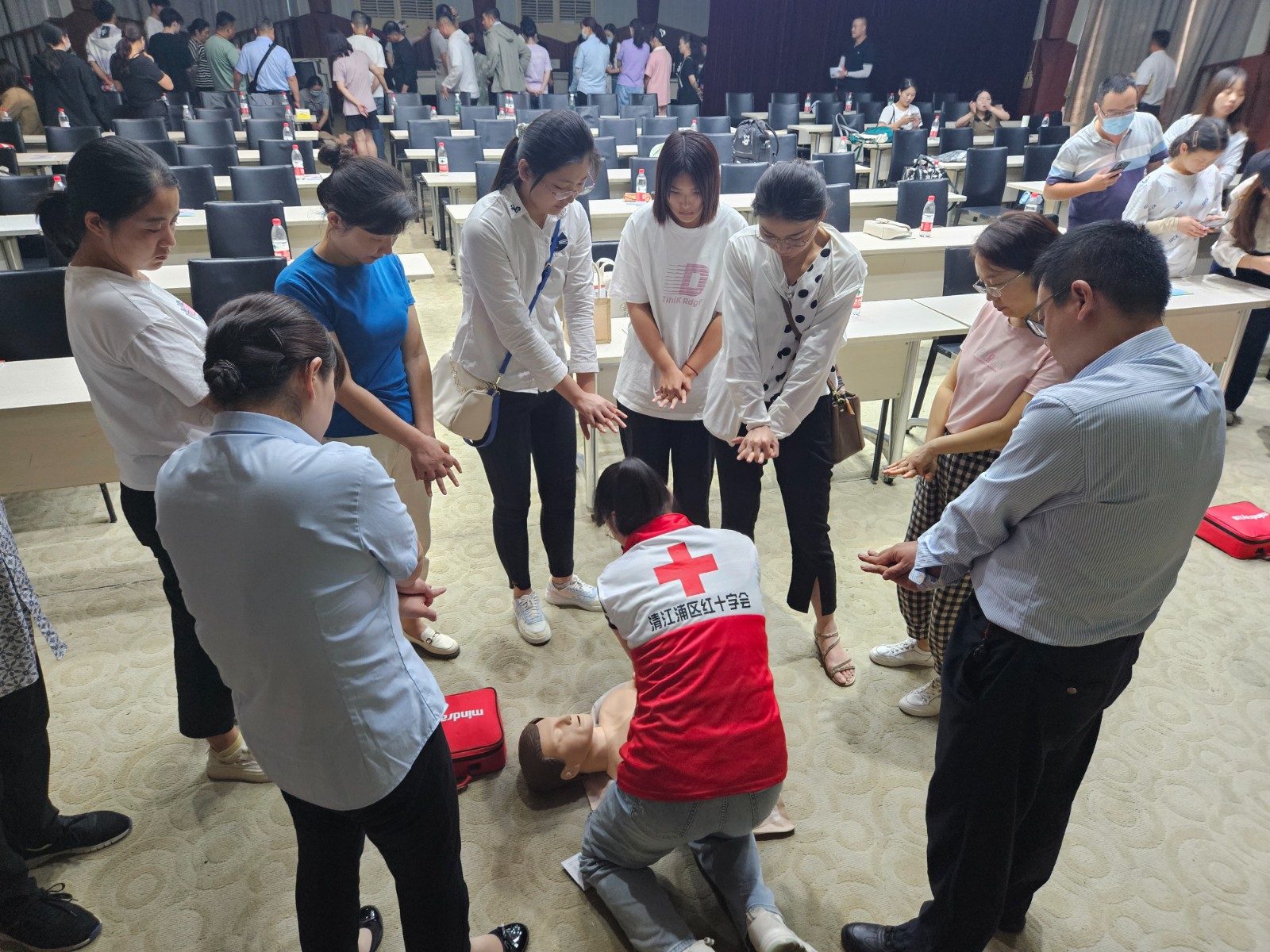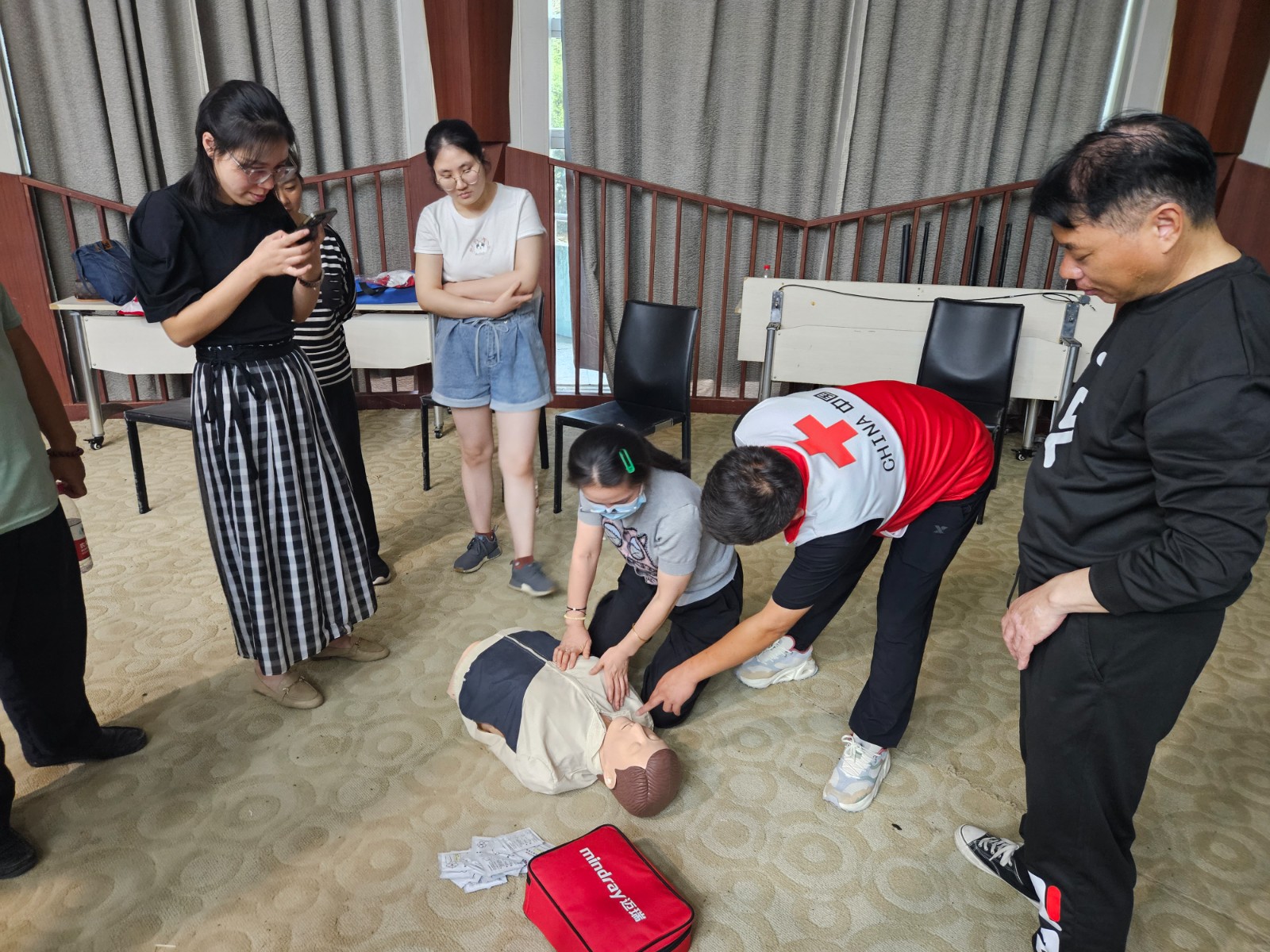 培训现场,清江浦区红十字会应急救护培训老师向学员们普及了AED的重要意义以及AED使用方法。在技能实操课程中,老师们将所有学员分为六组,分别为学员演示和指导AED的使用方法和心肺复苏、海姆立克急救法等具体内容,学员仔细听讲,认真观察,并主动参与互动和模拟练习,形成了良好的互动氛围。