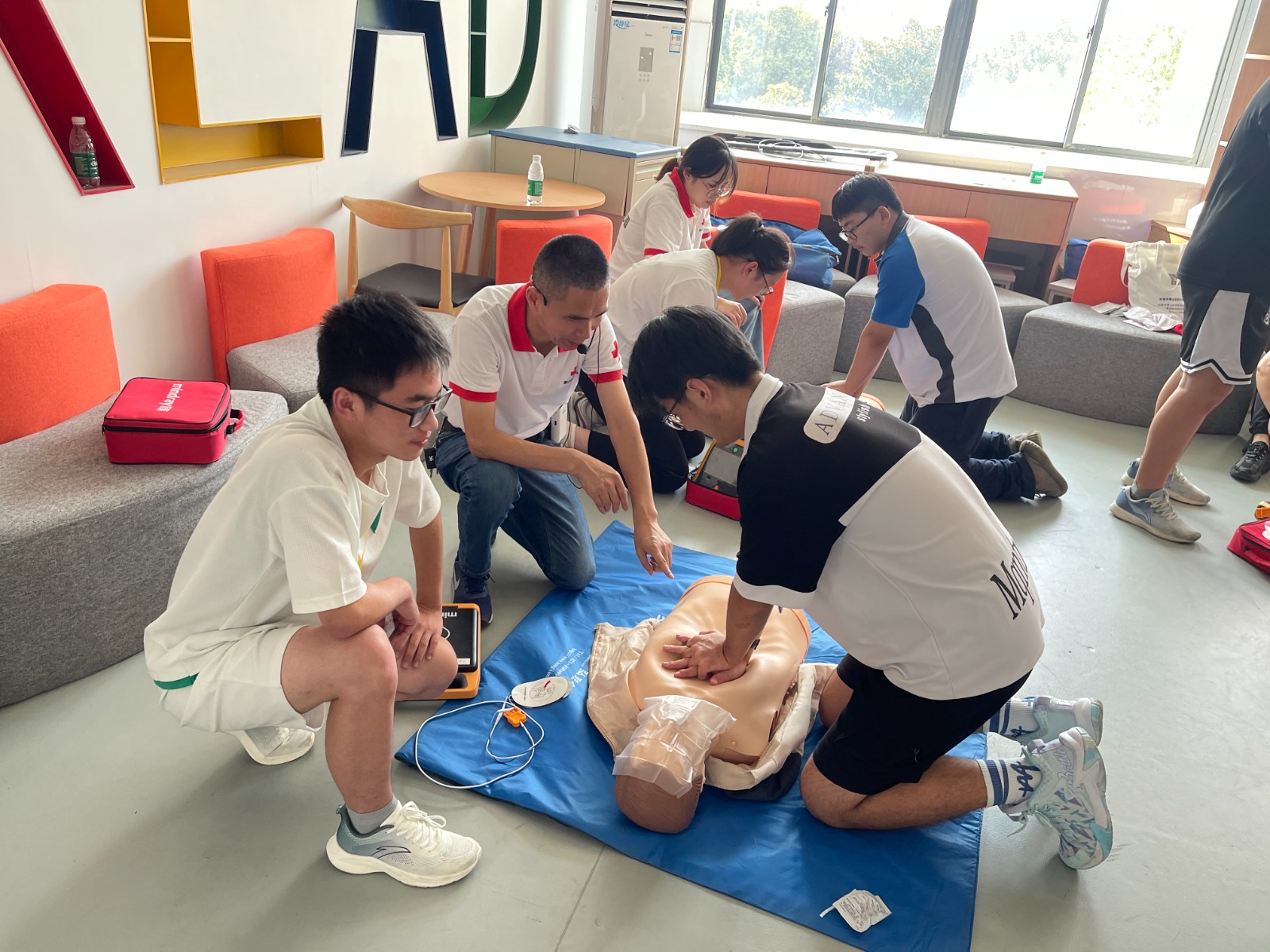 本次心肺复苏(CPR+AED)培训由陶晓老师授课,采取“现场授课+多媒体演示+实操体验”授课模式进行。从模拟患者心脏骤停、徒手心肺复苏、自动体外除颤仪的使用等方面进行专题培训。台上培训老师讲得认真,台下师生们听得仔细,看得明白,许多学生踊跃报名登台参与急救实操体验。随后,在助教老师指导下,学生们分组从判断患者意识和呼吸、呼救、摆放正确体位,到胸外心脏按压、开放气道、人工呼吸等环节,对心肺复苏程序进行了全流程体验,从而让学生们对什么是急救、如何抓住急救黄金时间提高急救成功率等有了更深刻的认识。