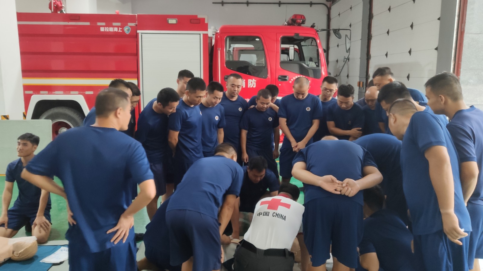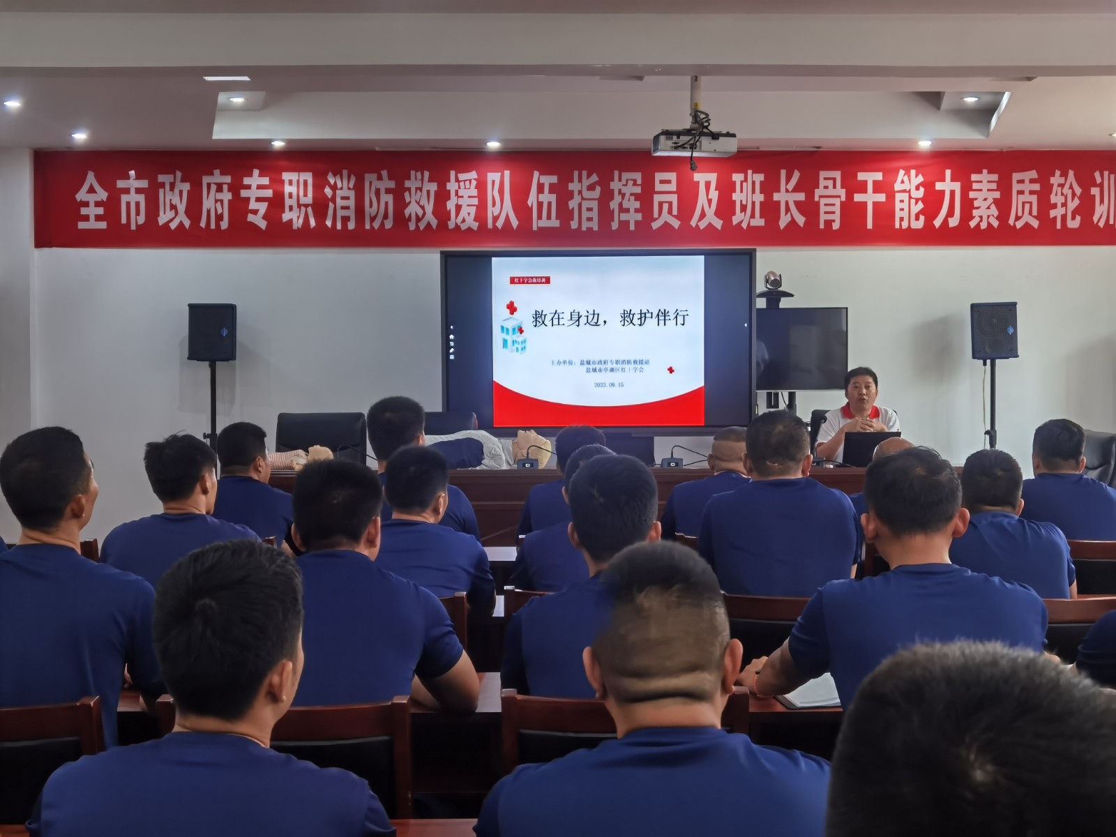 为充分发挥消防救援站与红十字会双方应急救援力量的资源优势,提升消防指战员事故现场应急救护能力,最大限度减少灾害事故对消防指战员和受灾群众造成的人身伤害,9月15日,盐城市亭湖区红十字会应急救护培训师走进西环路政府专职消防救援站,为参加全市政府专职消防救援队伍指挥员及班长骨干能力素质轮训班的“蓝朋友”开展应急救护知识宣传、救护技能培训。