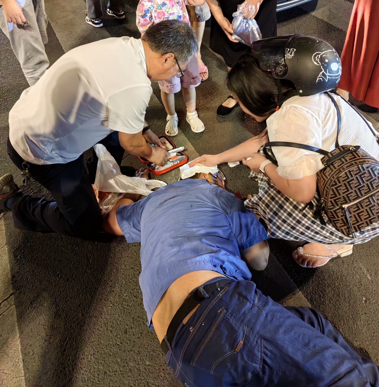 9月8日19点30分左右,晋陵路清凉路十字路口发生了一起交通事故,一个人侧卧在地上,头部附近的地面上有血迹,天宁区红十字会师资王宏、陆子平备战常州市红十字应急救护技能竞赛,刚刚结束了当天的集训,带着疲惫,回家途中路过事故现场。两位老师立即运用掌握的红十字救护技能,对伤者开展救护。经过初步检伤、判断,伤者头部出血严重,处于昏迷状态,立即对头部出血伤口进行了按压止血并包扎。在救护车到达后,配合医生将伤者移入担架,抬上救护车。全部施救过程严格按照红十字应急救护操作要求实施,精准迅速。