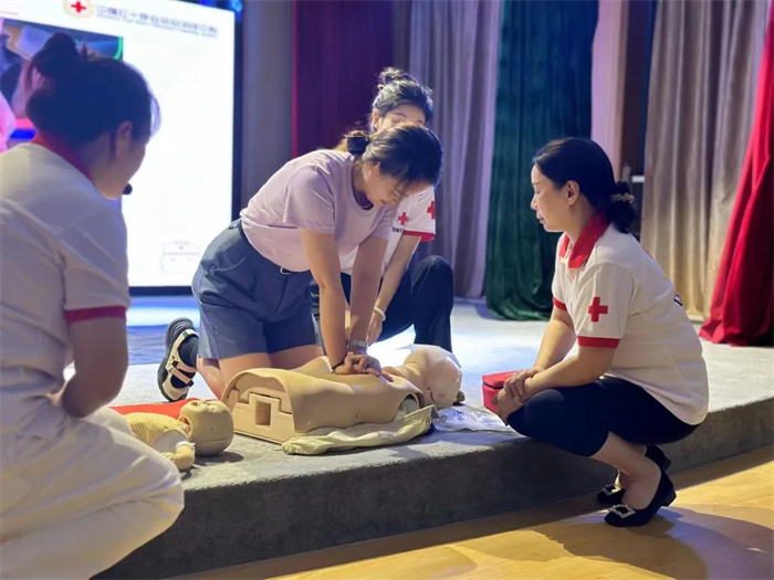9月15日,市红十字应急救护师资队在盐城机电高等职业技术学校开展新生应急救护普及培训活动。