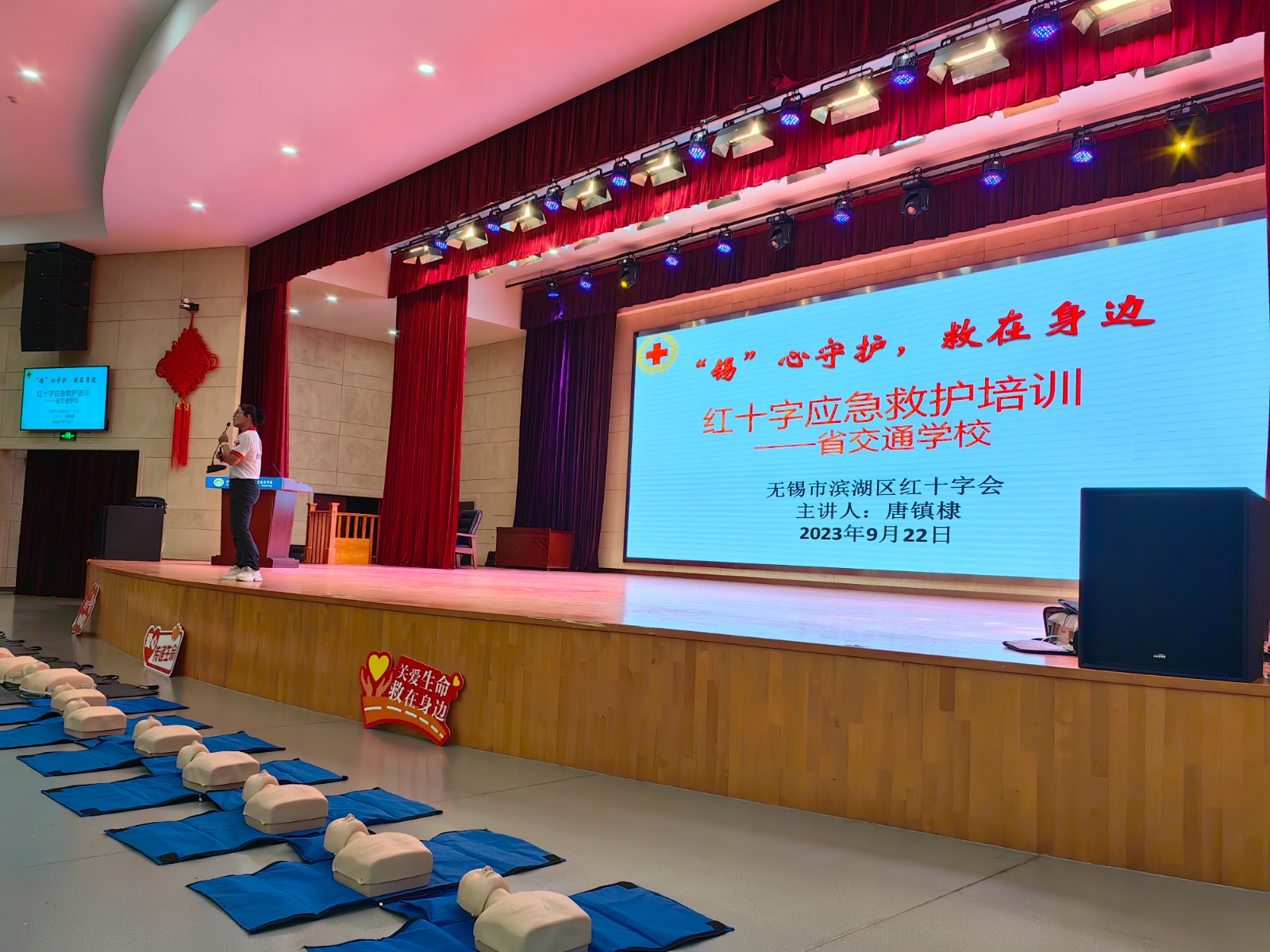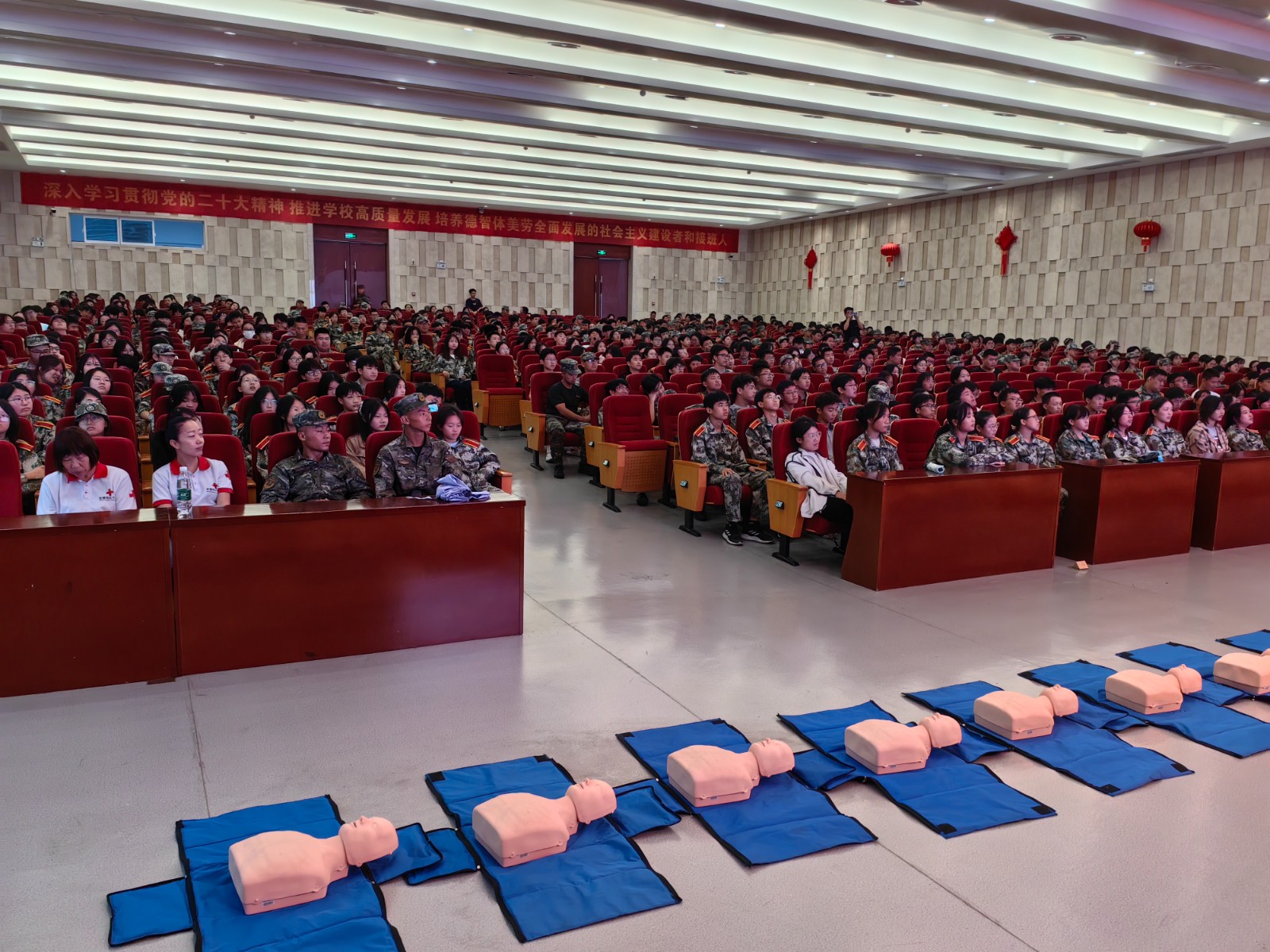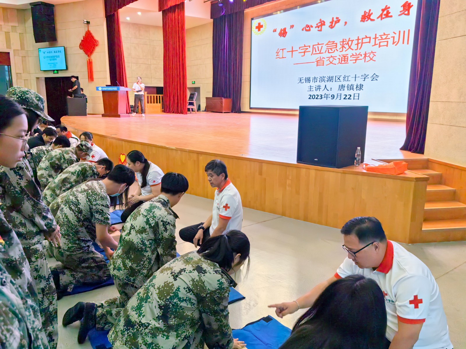为进一步提高学生安全防范意识以及应对突发事件的自救互救能力,同时丰富校园军训活动内容,9月22日下午,学校邀请无锡市滨湖区红十字会救护师走进学校开展应急救护普及培训,学校2000余名新生分批次参加了培训。