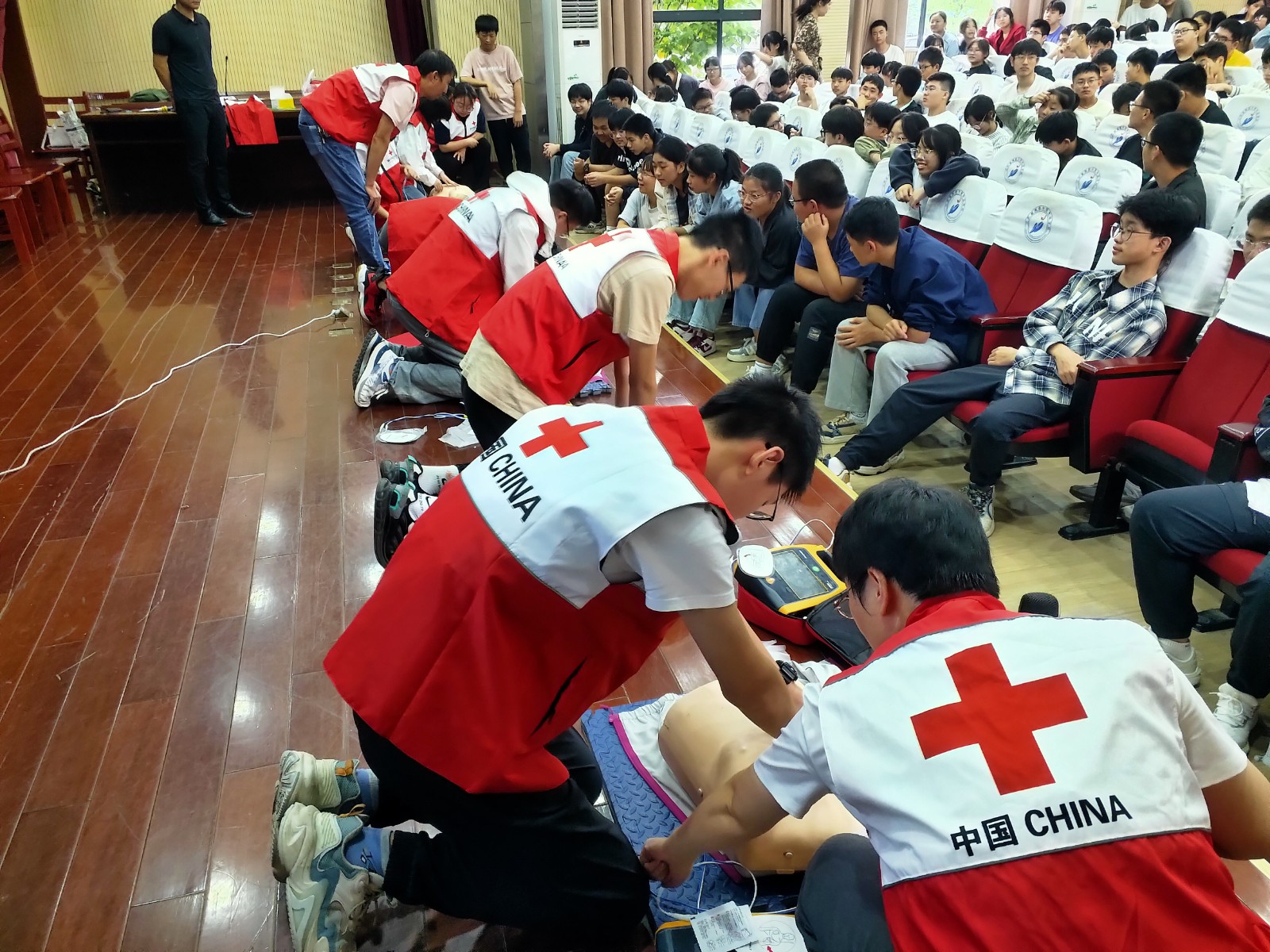 此次培训分为两个环节:首先由红十字应急救护培训师王梅芳讲解,红十字志愿者演示操作。然后在讲解演示的基础上,让学生进行心肺复苏和气道梗阻急救操作,培训老师手把手指导,纠正错误动作,确保每一位同学掌握重要技能。在实操演练中,学生们情绪高涨,逐组进行。