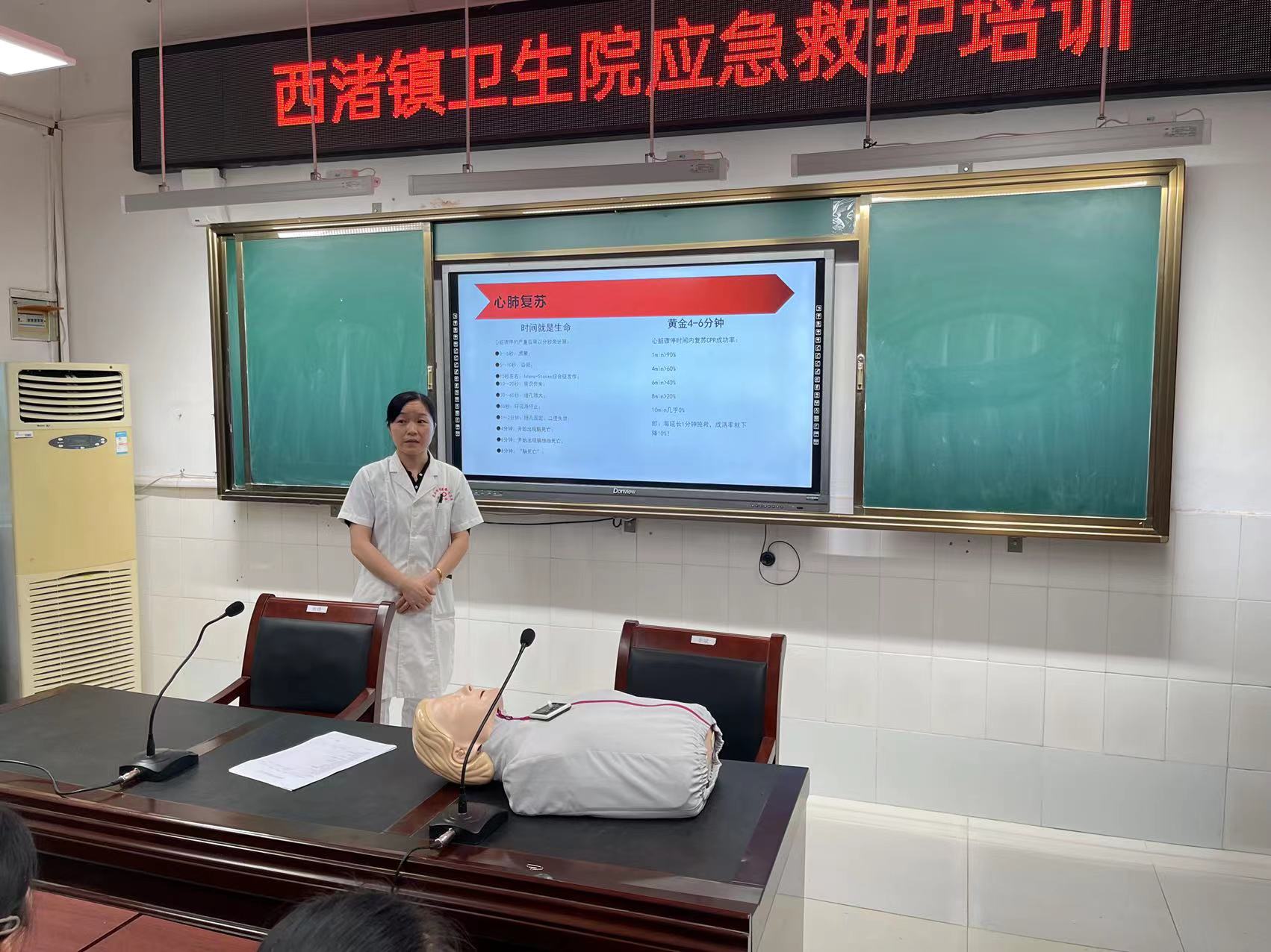 培训开始,西渚镇卫生院的医务人员首先给大家讲解了心肺复苏的重要性,心肺复苏可谓是争分夺秒。接着,又利用模拟人型进行了心肺复苏现场急救演示,包括判断有无意识、判断有无自主呼吸、判断有无脉搏、进行胸外心脏按压等操作,边讲解边实操向师生们详细讲解每个动作的要领。为确保此次培训取得实效,讲解结束后学生也进行了现场的急救操作,卫生院医务人员给予一一指导和纠正。
