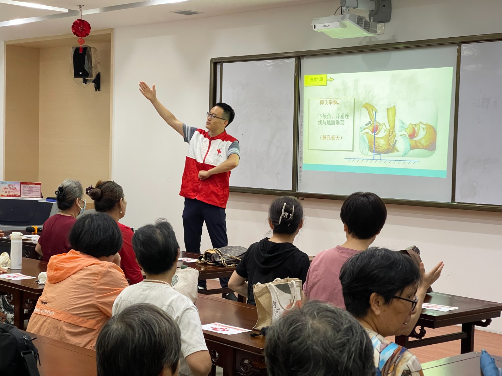 红十字救护培训师首先向社区居民宣传学习急救“黄金四分钟”的重要性,用通俗易懂的语言讲解了急救技能的原理及海姆立克急救法的操作过程。居民们纷纷进行实操体验,对操作过程中出现的一些常见错误,红十字救护培训师一一进行讲解和纠正,有效帮助居民掌握急救技能。