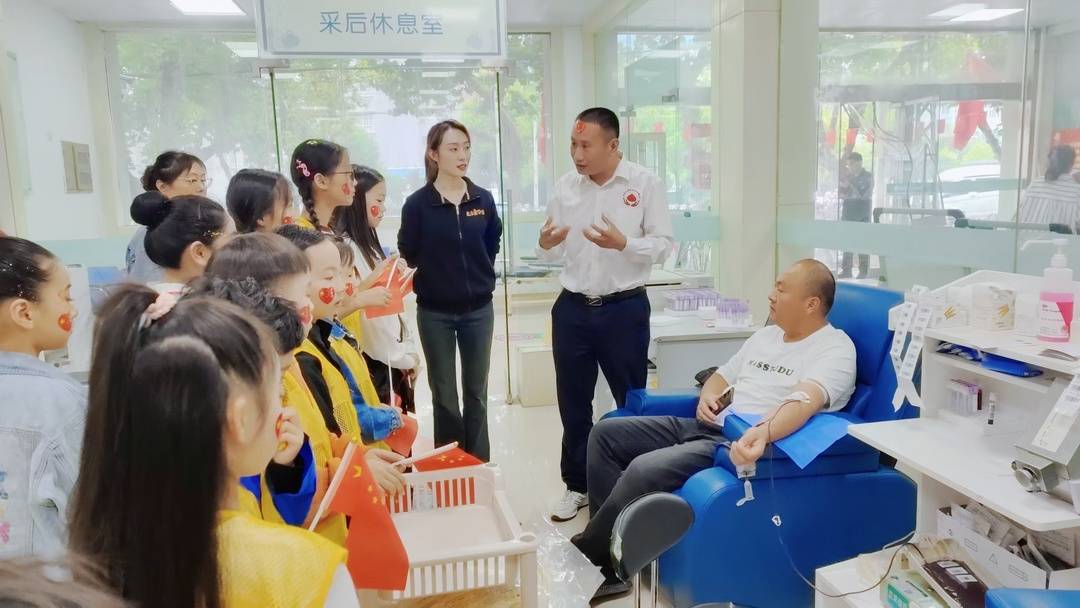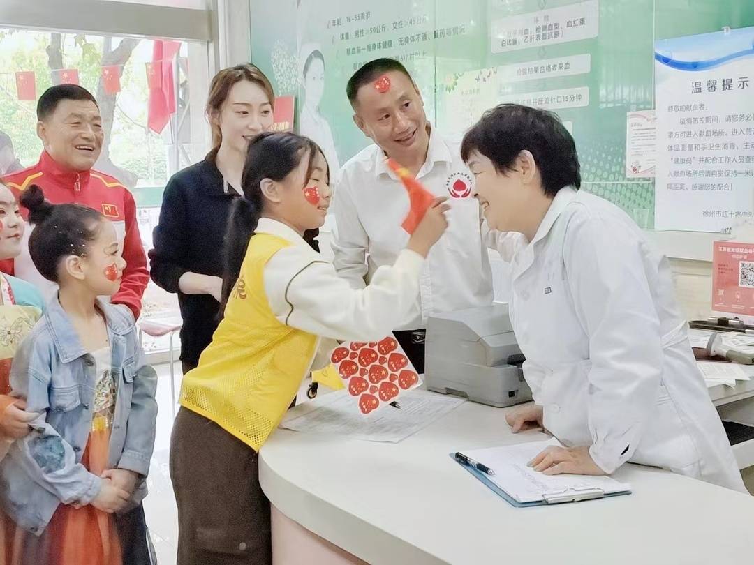 4日下午3时,志愿者和同学们来到丰县爱心献血屋,同学们用爱心义卖的善款购买了农夫山泉水,赠送给坚守岗位的血站医务人员和志愿者。同学们还在石怀举队长的带领下,参观了献血屋的设施,了解无偿献血知识。现场,志愿者和同学们还表演了精心准备的文艺节目。