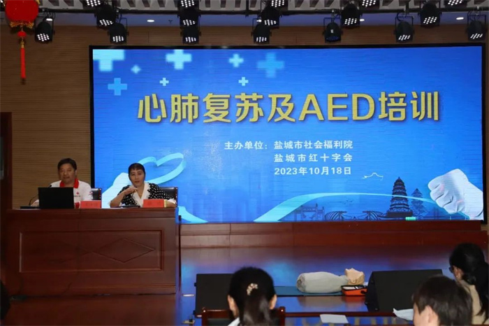 10月18日,市红十字应急救护师资队为市社会福利院70余名职工开展CPR+AED应急救护持证培训。