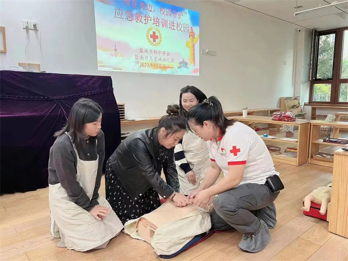 10月20日,市红十字应急救护师资队分别来到市文峰初级中学、盐南日月星城幼儿园为40余名教职员工、180余名学生开展应急救护知识普及活动。