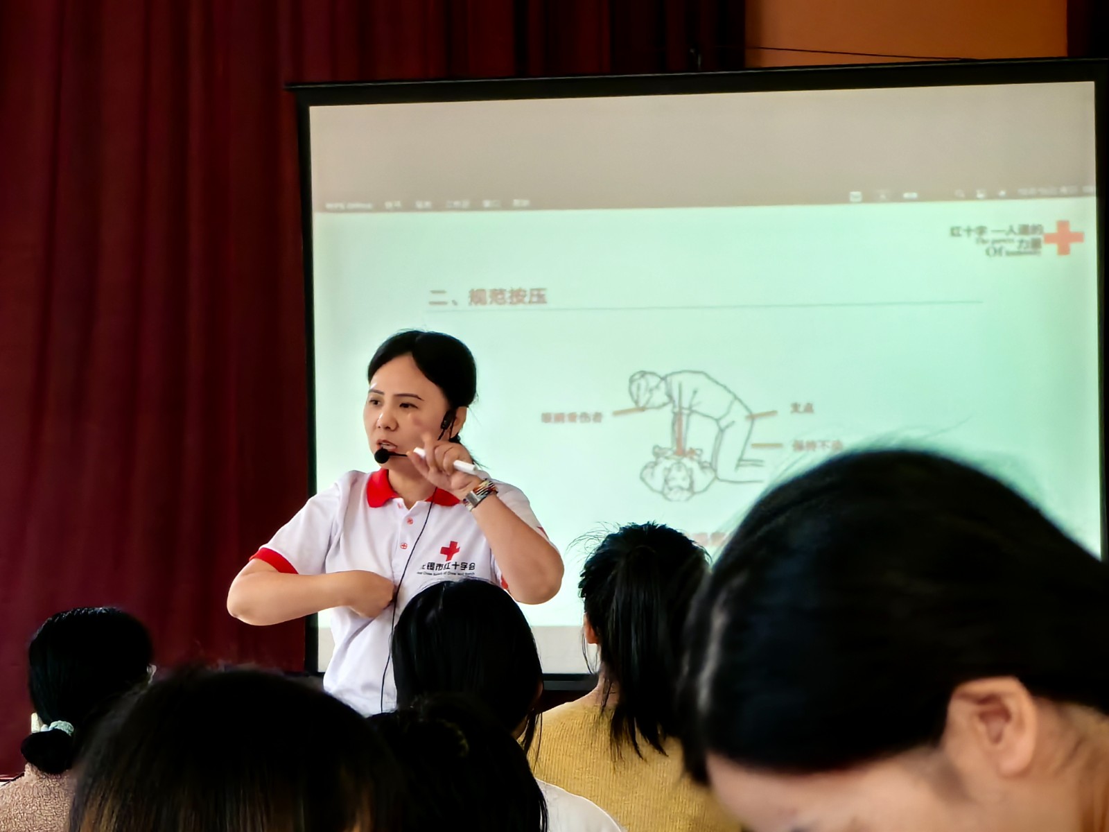 红十字救护培训范老师用通俗易懂的语言向同学们讲解了红十字的由来、心肺复苏、AED操作等知识,以及气道异物梗阻、溺水、中暑等常见意外伤害的急救方法。理论授课结束后,同学们分组进行心肺复苏的操练。培训师在旁指导,及时纠正错误动作,让每一位同学都能掌握心肺复苏等急救操作。两场培训共有91位学员通过理论和操作考核,街道红十字会依据规定向考核合格的学员颁发了CPR+AED救护证书。
