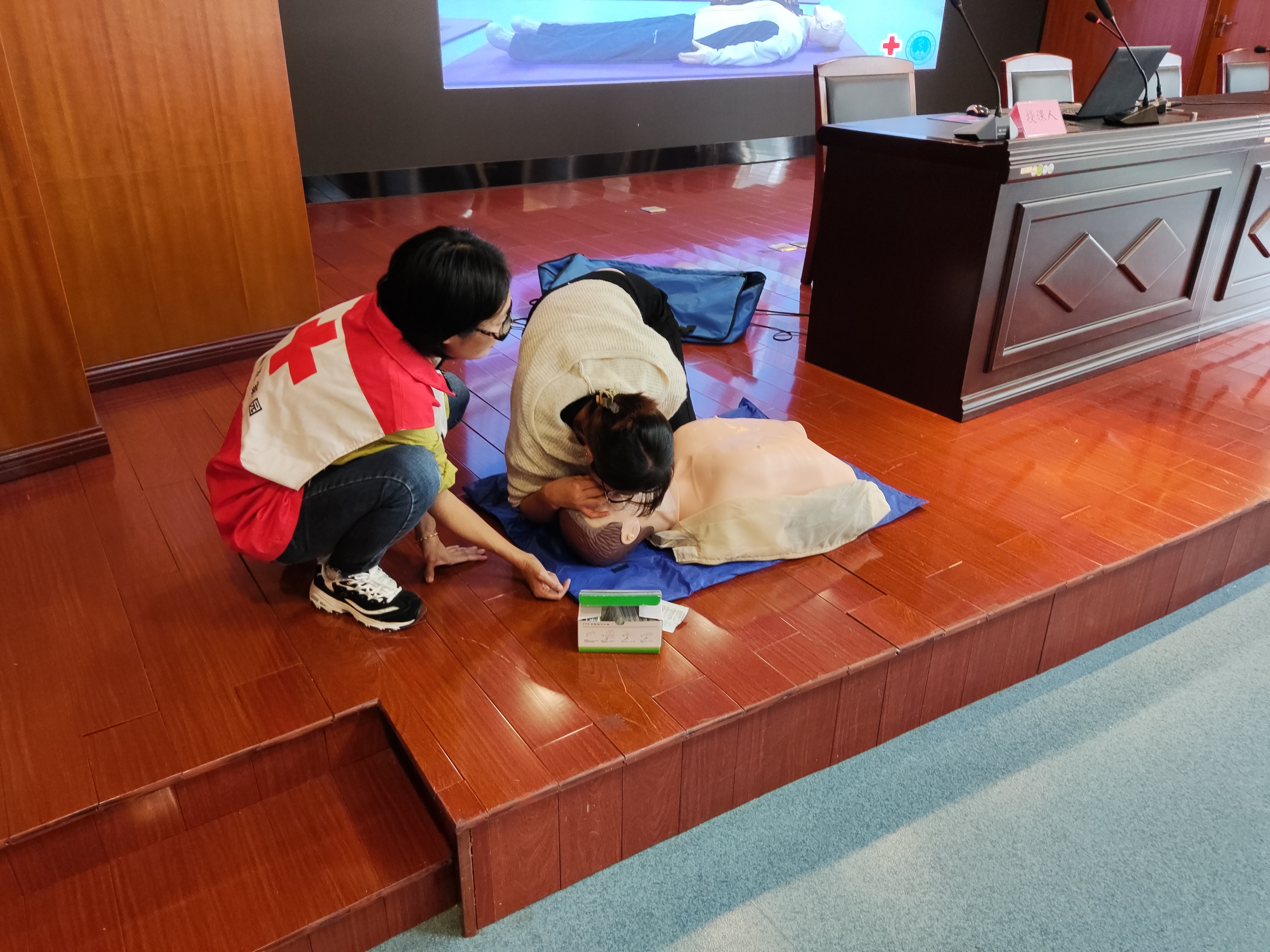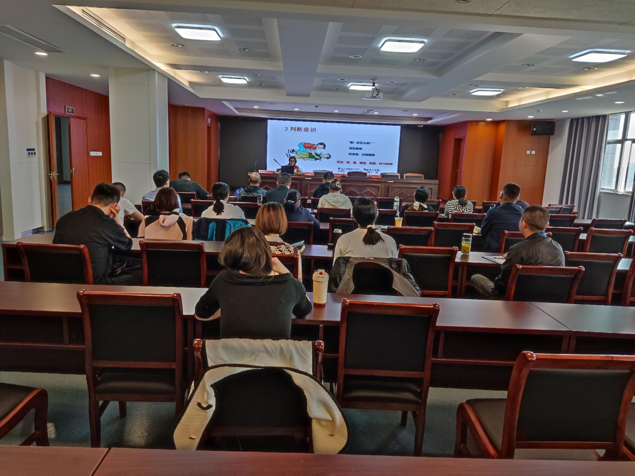 培训共分为理论教学和实践操作两个部分。首先红十字会培训老师向学员们讲述了心肺复苏术的基本原理,让大家了解到了呼吸骤停黄金救援时间4分钟的重要性。老师带领大家学习了心肺复苏操作流程,具体讲解了胸外按压的位置、深度和频率。随后又以生动的实例讲授了气道异物阻塞等课程,还向大家演示了心肺复苏术、“海姆立克”急救法等急救护技术。为了使大家更好地掌握心肺复苏等技术的要领,培训老师还利用人体模型进行现场互动演示,指导参训人员逐个操作演练,手把手传授急救手法和注意事项,让参训人员真正学懂弄通急救要领,学有所获。