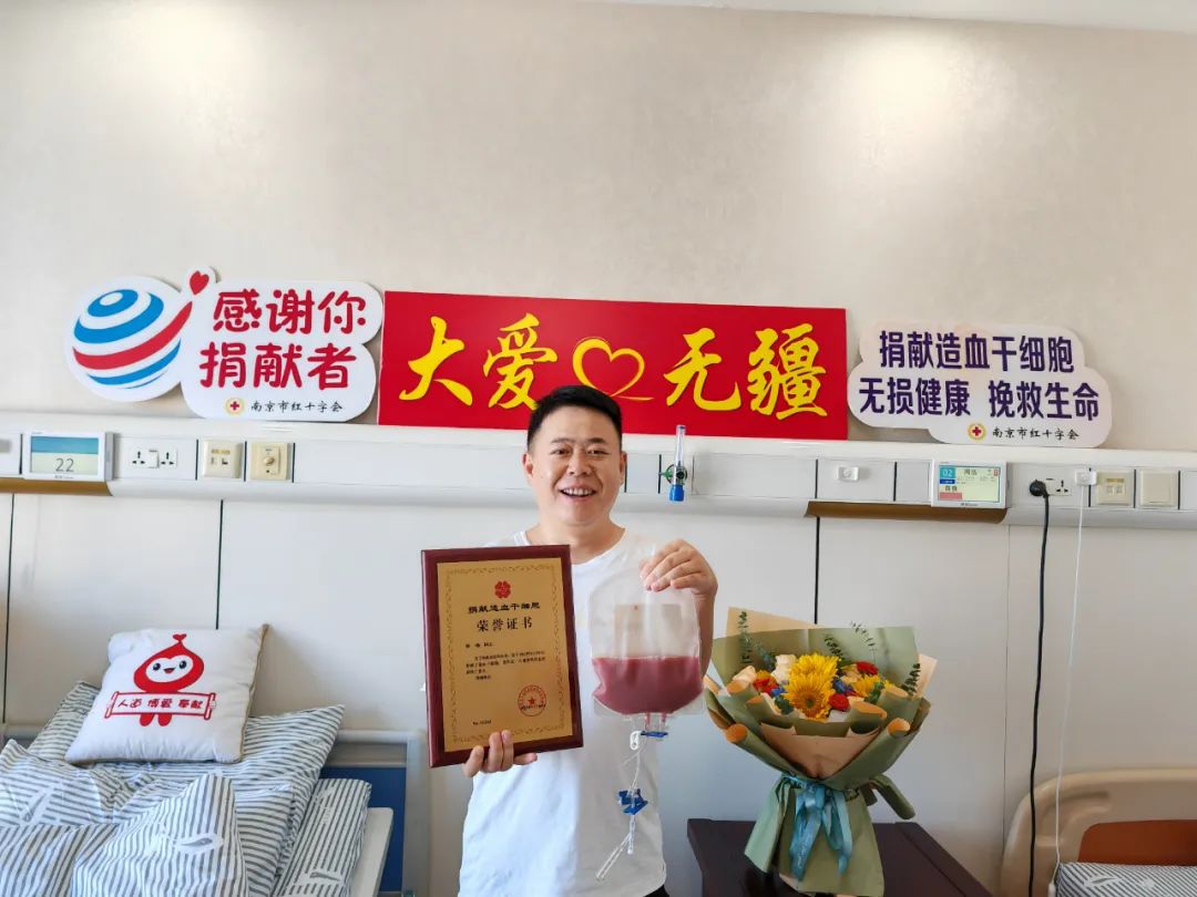 11月1日,退役军人周浩在东南大学附属中大医院,经过约4个多小时的采集,成功捐献334毫升造血干细胞混悬液,为一名素不相识的患者送去生命的希望,成为江宁区第21位、南京市第168位造血干细胞捐献者。