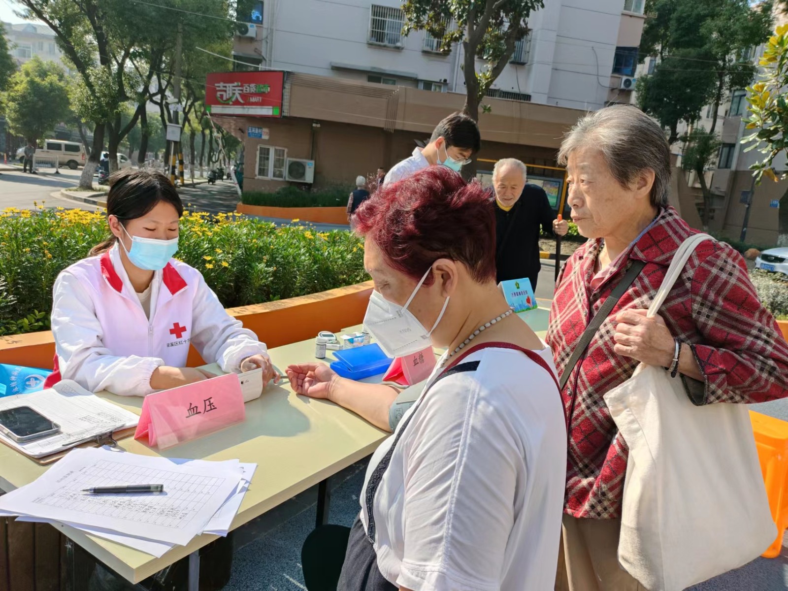 义诊区,社区医院的医生和红十字志愿者向居民朋友普及健康知识,并对居民提出的健康问题进行现场答疑,给出合理的建议。医生细心地为在场的居民提供测量血糖、血压等服务,对于检查结果异常的居民,贴心地为居民提供诊疗意见并提醒居民及时去医院进一步检查,以免耽误病情。