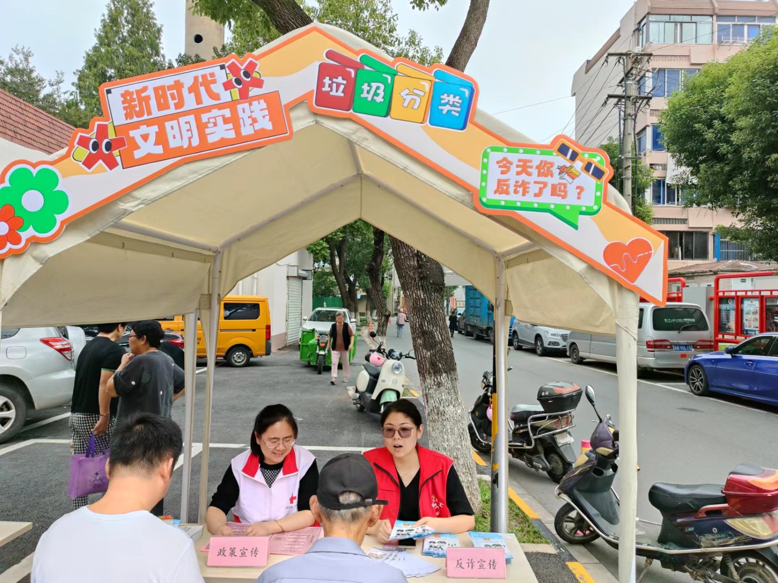 政策宣传区,社区红十字志愿者为居民讲解垃圾分类、反诈宣传知识,普及相关法律知识。反诈宣传从身边的事例分析,让居民朋友“防微杜渐”,时刻保持警惕。垃圾分类宣传呼吁居民“垃圾分类从我做起,保护环境人人有责”,一起创建卫生文明的社区环境。