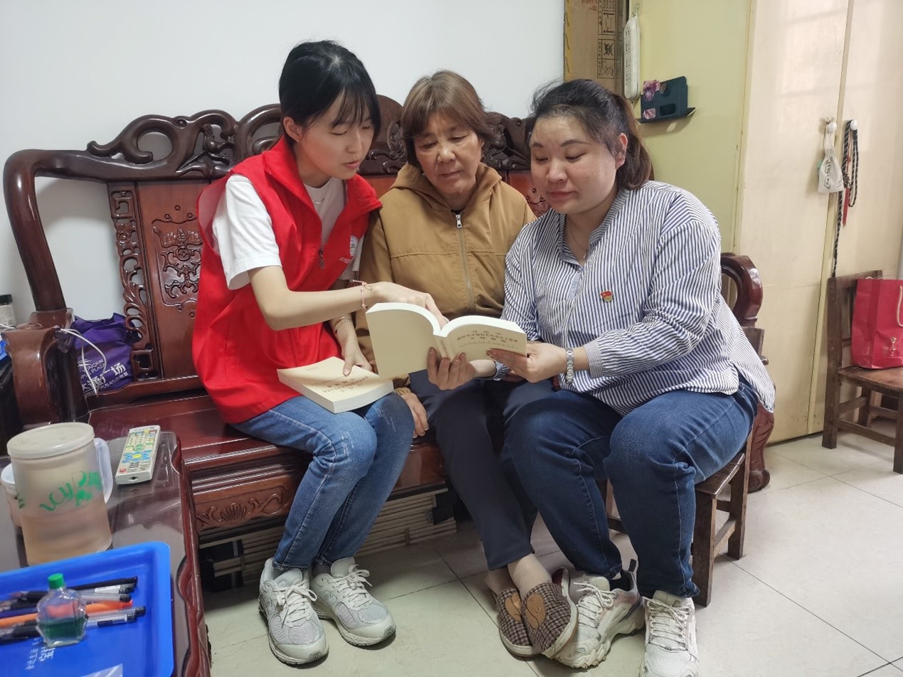 志愿者们来到空巢老人张瑞芳家中,为老人测量血压、按摩、打扫卫生等。由于老人视力下降,只能借助放大镜来阅读,很不方便,活动当天,志愿者还带来报刊书籍,为老人们带来及时新闻、健康常识、生活小窍门等多方面的信息,大家相互交流书本上的内容,在交流中加深了彼此的阅读领悟。