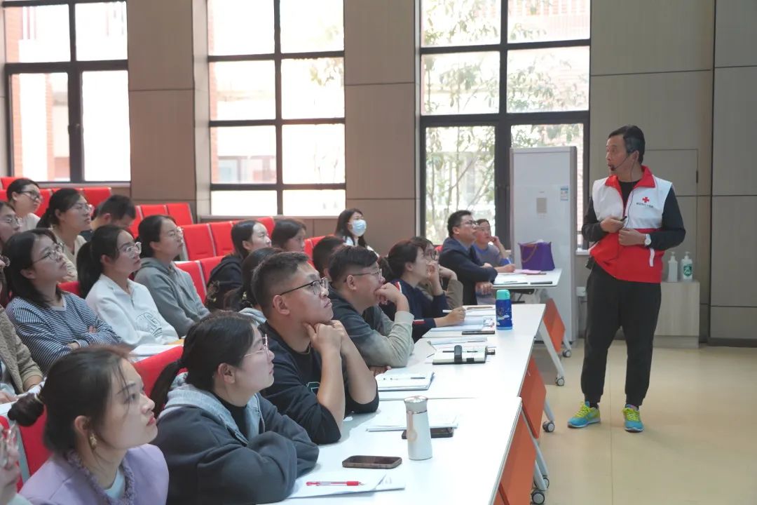 我校特聘淮安市红十字会应急救护师杨森老师对全体班主任进行应急救护知识培训,让大家了解常见突发事故的特点,掌握现场急救基础知识与基本技能,以便在各种急症与灾害面前能够进行自救与救护他人,切实保护青少年生命健康,为创建平安校园提供保障。