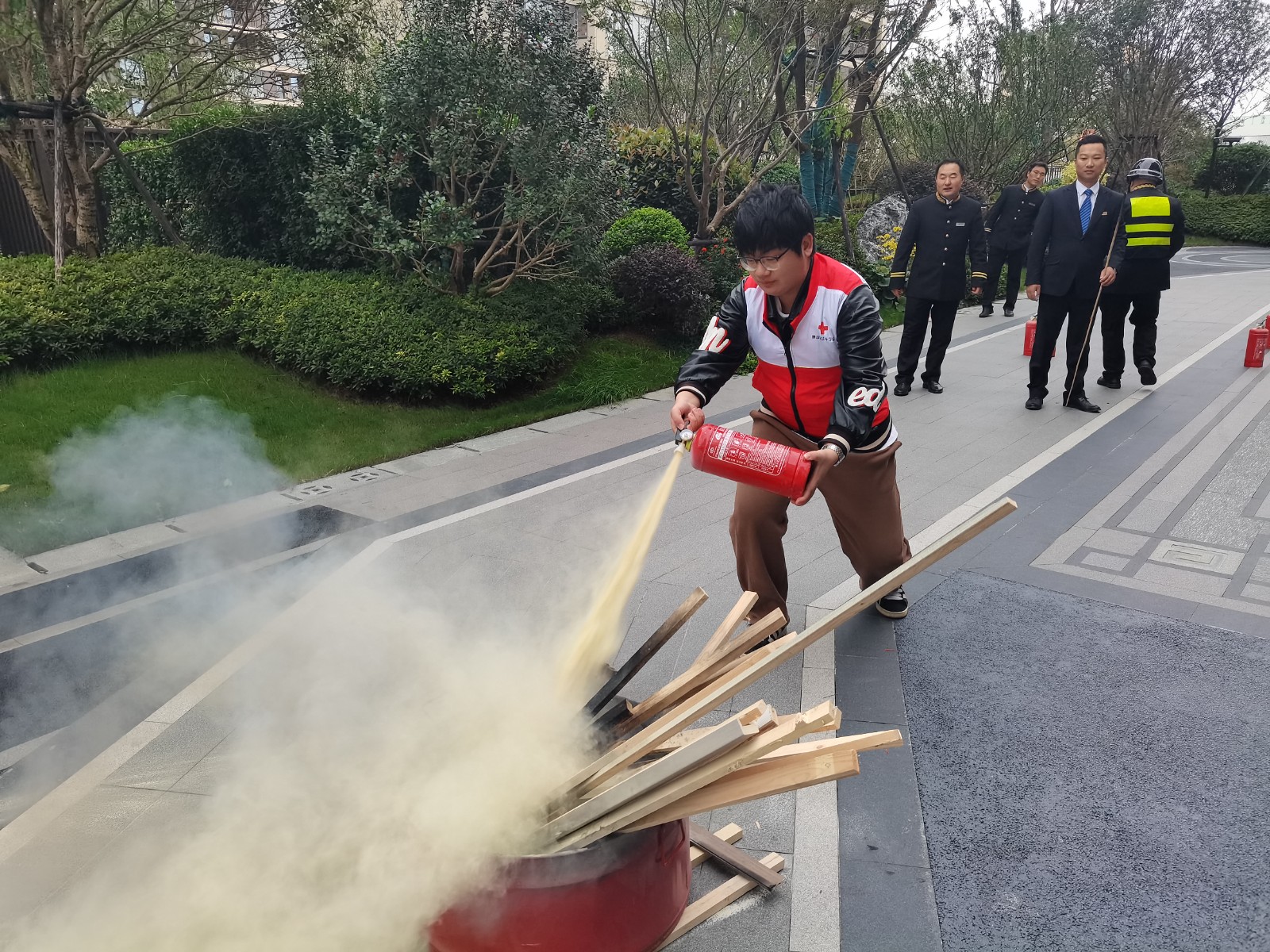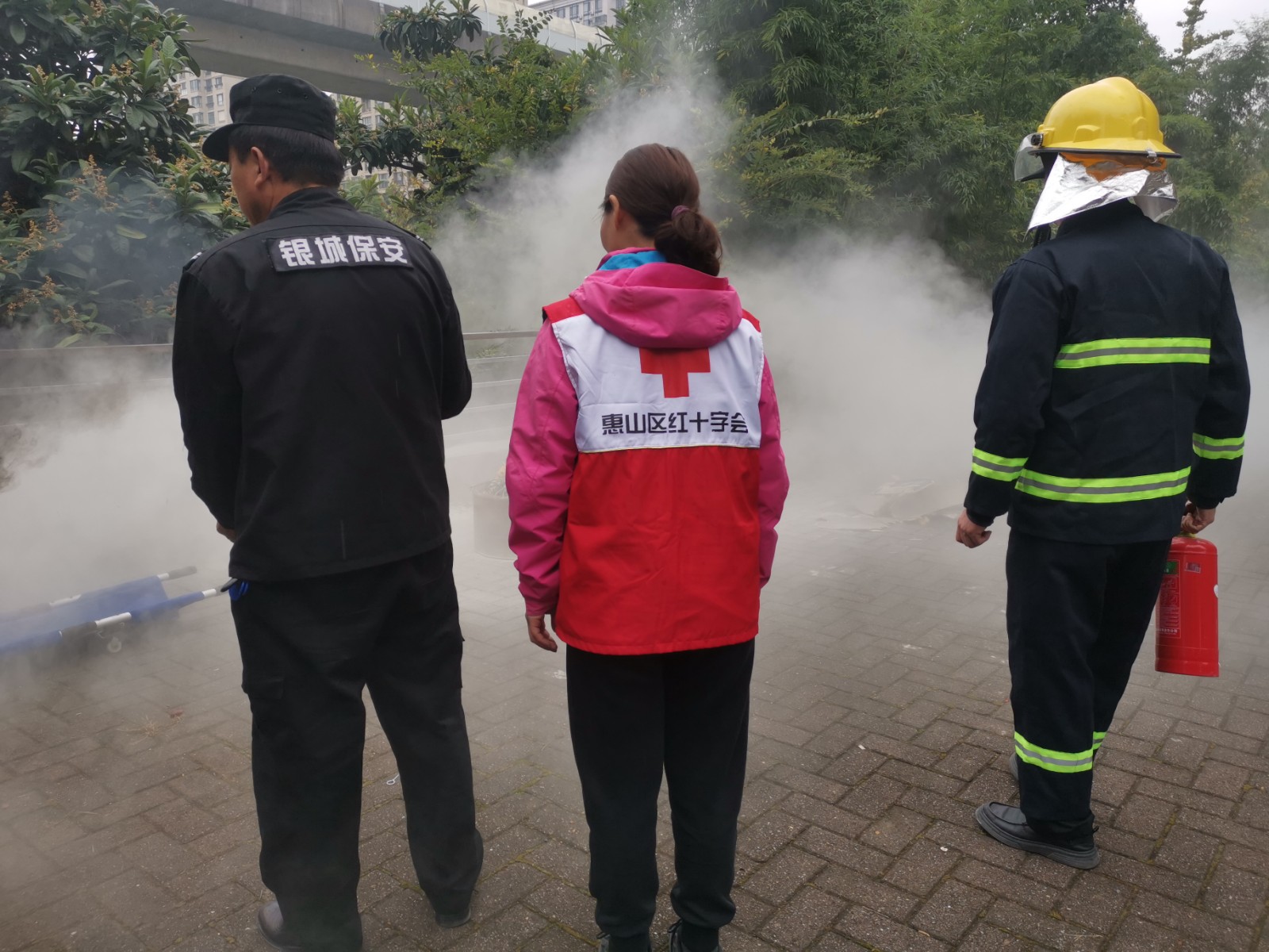 11月9日,长安街道惠南一社区红十字会联合银城物业公司带领志愿队在小区内进行消防演习。在物业经理的组织和带领下,志愿者们分成设备保障组、后勤保障组、救护组、灭火组四个组别,每个参与者都明确了自己的岗位和职责。按预定时间演习准时开始,首先物业人员向前来参加的居民普及了日常生活消防知识,讲解了灭火器等消防器材的使用方法、注意事项及煤气罐火灾常见的扑救方法的培训。随后,在保证安全的前提下,进行了实地模拟灭火演习,居民们在工作人员的指导下纷纷向前尝试,有很多居民都是第一次接触消防栓,刚开始很胆怯,但是在掌握了使用方法后都能成功灭火。最后,进行了本次演习的重要部分——居民楼失火消防演习,工作人员触发火警报警器后,传来响亮的火警警报,居民和志愿者按照之前学习的消防安全知识进行迅速有序撤离,大家捂紧口鼻通过消防通道安全逃生,很快大家都成功疏散至安全地带,同时,“消防员”们在外面迅速铺设管道,准备灭火,救护人员前往现场抢球伤员,用担架把伤员抬至安全地带进行现场模拟抢救。楼道失火模拟演习中,现场秩序井然,大家都能学以致用,有效应对突如其来的火灾危险。