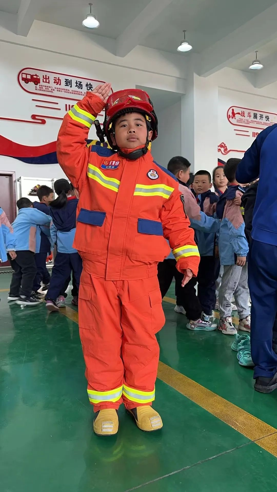 在消防员叔叔的帮助下,孩子们披上了重重的防护服和头盔,变成了“小小消防员”,虽然消防服很酷,但是真的好重呀,孩子们体会到消防员叔叔在执行任务时是多么辛苦呀,让我们向消防员致敬!