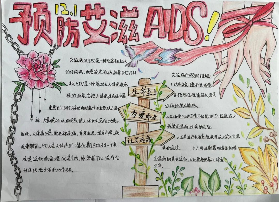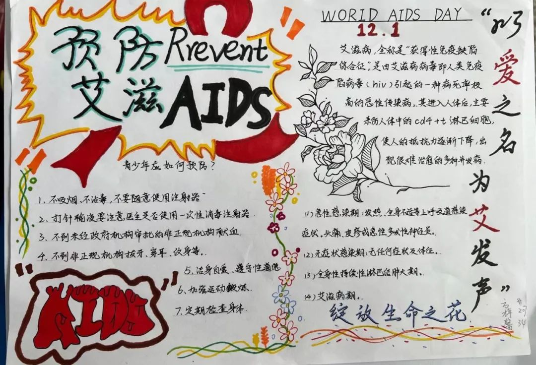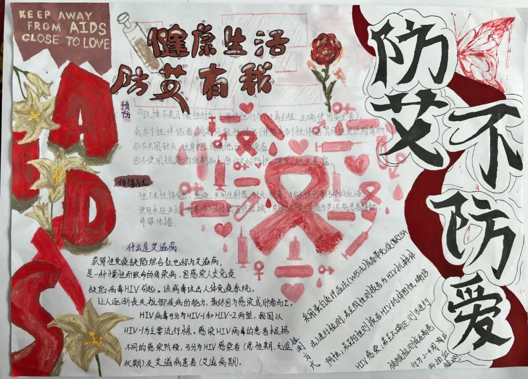 通过一张纸小小的手抄报,同学们展现了有关艾滋病的基本知识、如何预防艾滋病以及如何包容关爱艾滋病患者。图文并茂的手抄报描绘出同学们心中对艾滋病的认知与感悟,增强了同学们的自我保护意识和关心他人的社会责任感。