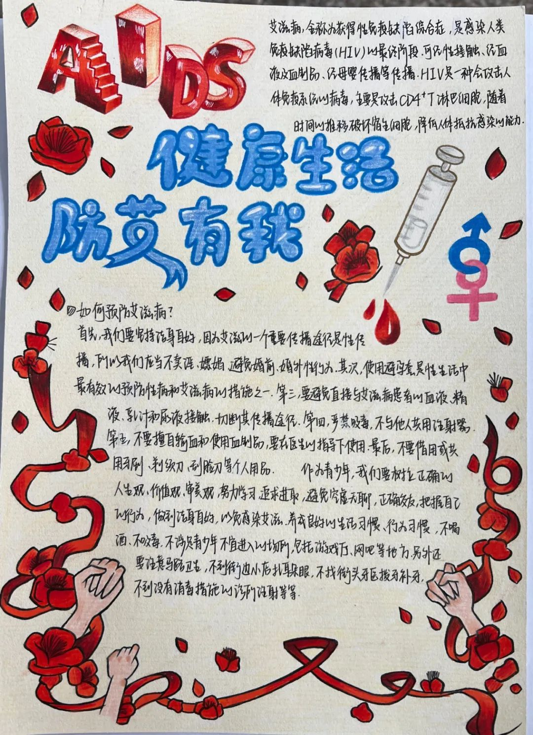 为进一步推动学校艾滋病预防宣教工作的高质量发展,提高同学们对艾滋病的自我防护意识,增强同学们的社会责任感,汇龙中学举办了“预防艾滋病”手抄报比赛。