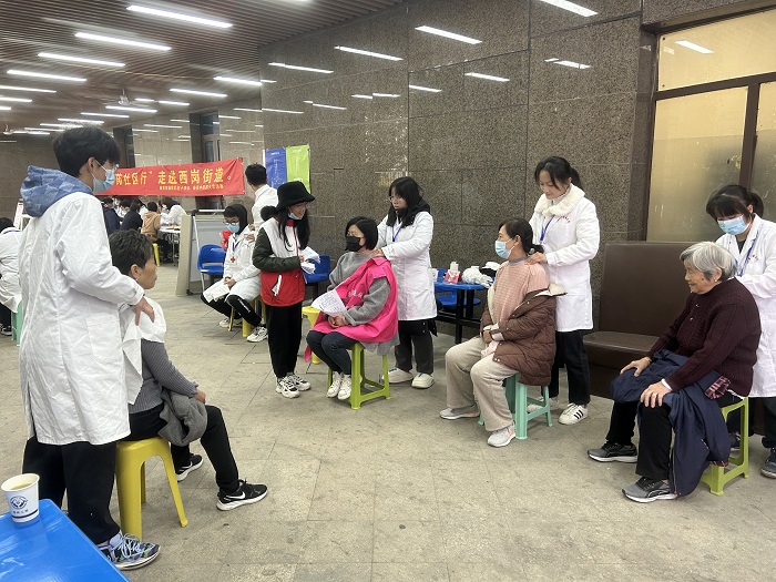 活动现场,大学生志愿者为社区居民提供了量血压、测血糖等基础医疗服务,同时,还带来了针灸、推拿、耳针耳穴、养生茶体验、养生知识宣传等中医药特色服务。