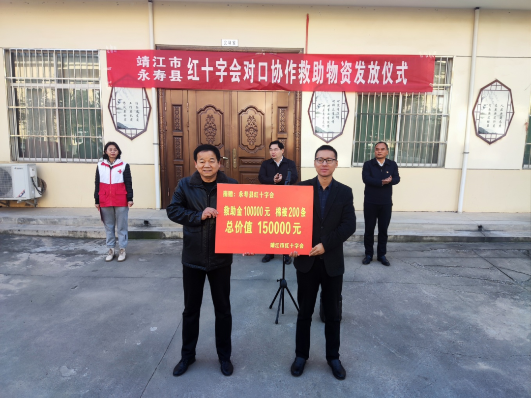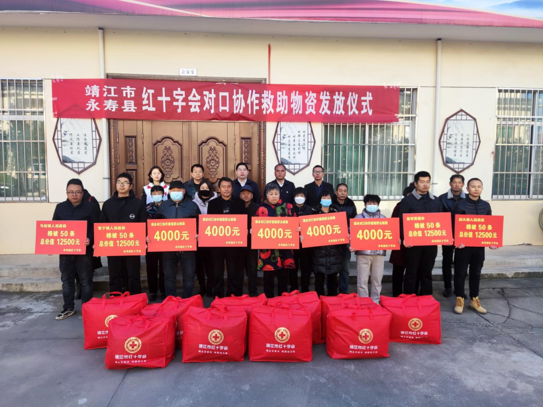 自2019年以来,靖江市红十字会已连续第五个年头对永寿县进行援助。本次援助物资总价值150000元。其中,救助金100000元,将分别发放给25名重大疾病患者;棉被200条,按每人1条标准发放至监军街道办、常宁镇、店头镇、马坊镇的困难群众手中。