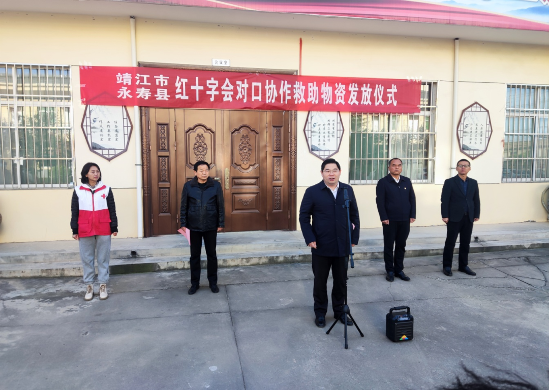 11月16日,永寿县在监军街道办举行靖江市·永寿县红十字会对口协作救助物资发放仪式。县委常委、副县长陈伟出席仪式并讲话。县红十字会、监军街道办、发改局等相关部门负责同志,受助镇办分管领导,以及受助困难群众代表参加仪式。