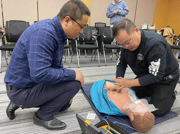 培训活动中邀请了区红十字会师资围绕心肺复苏和AED操作技能现场教学,利用PPT对人社职工进行了图文并茂的专业理论知识讲解及模型亲身示范心肺复苏的救护过程,包含检查意识、胸外按压、人工呼吸,强调了心肺复苏的黄金时间、胸外心脏按压部位、频率、深度、按压与吹气比例等。另外还邀请两位助教老师代表尝试进行心肺复苏模拟情景演练,对按压部位和按压姿势进行跟练指导,人社职工从中受益良多。