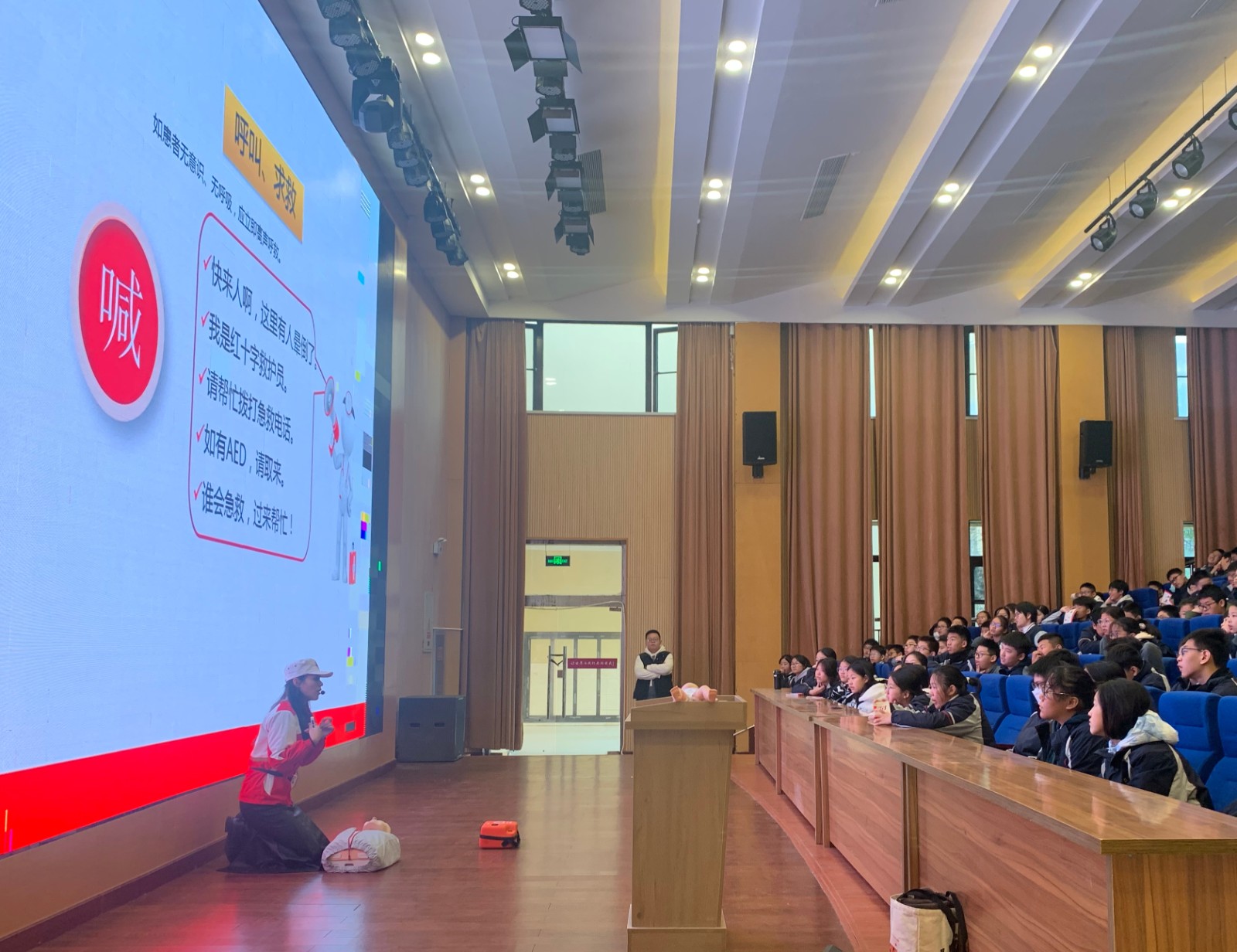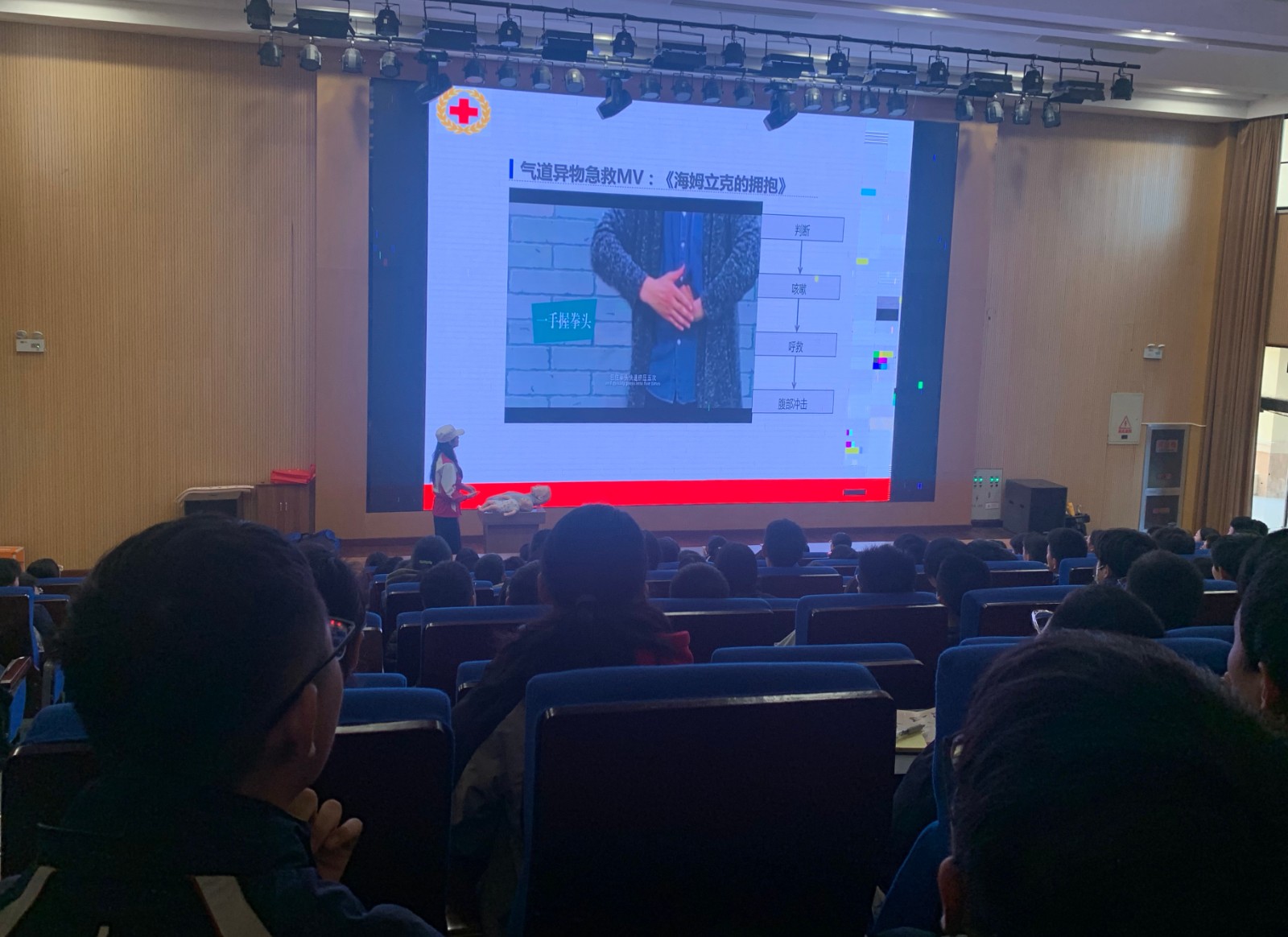启东市红十字赈济救援队成员采用理论知识讲授与实际操作相结合的形式,为同学们现场演示了气道异物梗阻急救法、心肺复苏术、AED的使用方法等,让大家了解发生意外伤害时应该如何应急处理。让同学们明确操作流程和要点,掌握常见急症、意外伤害、突发事件的处置要领。通过生动的学习和现场演示,同学们初步掌握部分现场急救知识。