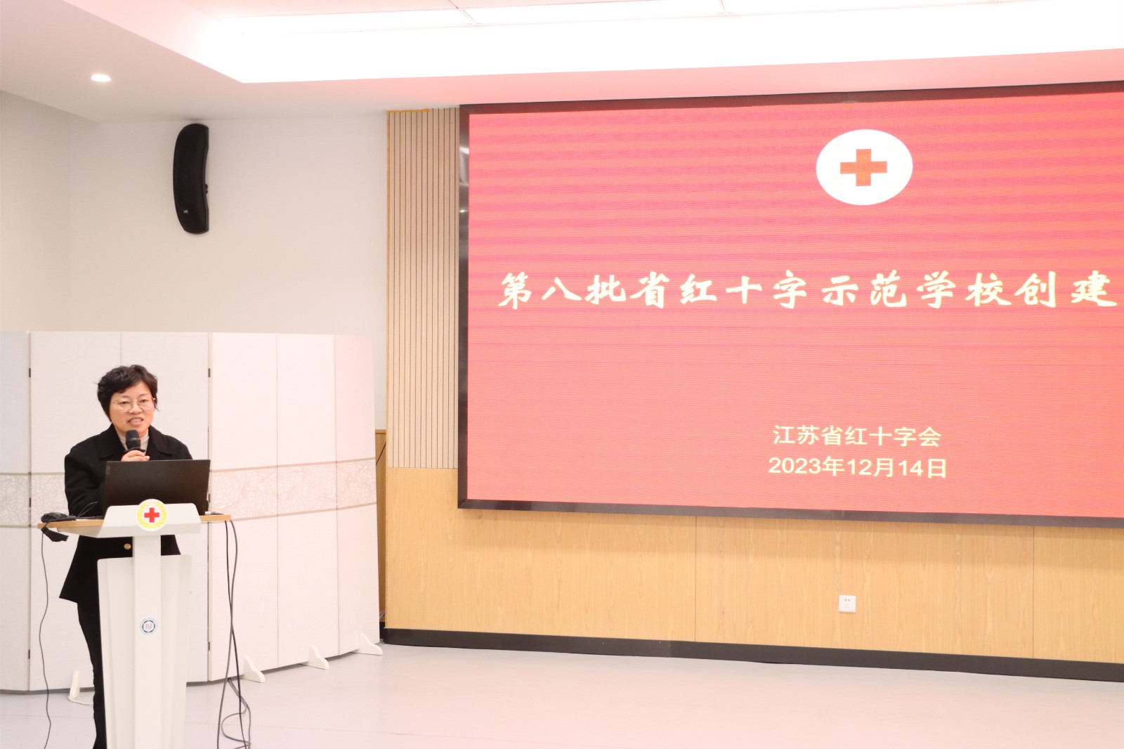 12月14日,江苏省第八批红十字示范学校(苏州、无锡)创建评审会在张家港市实验小学(西校区)举行。省红十字会组宣部部长丁玉琴出席评审会并讲话,来自苏州、无锡的25所申报学校有关负责人参加。