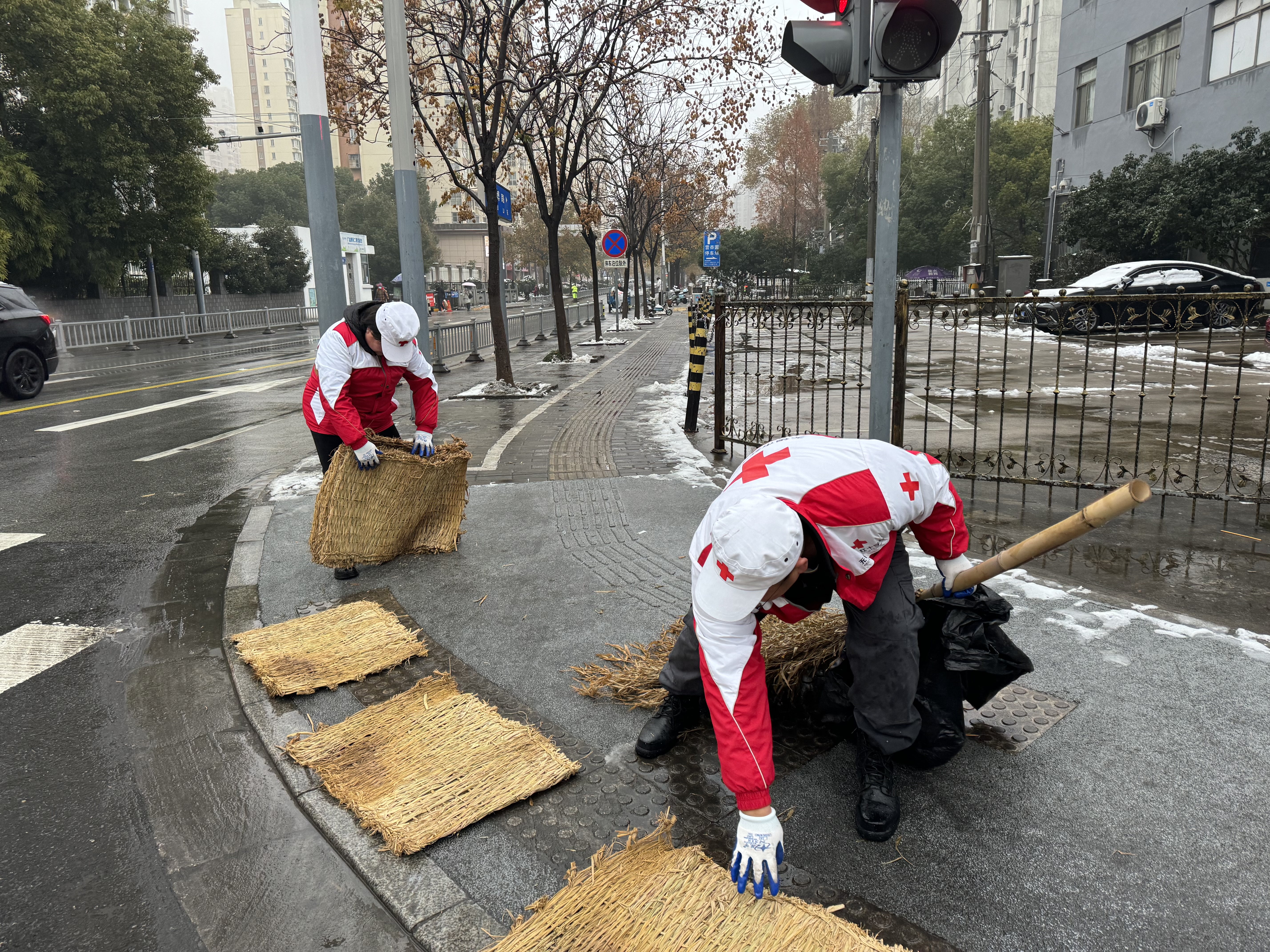 2023年12月19日,天还没亮,无锡市红十字会已组织市红十字赈济救援队在梁溪区广益街道广丰社区开展破冰除雪行动。