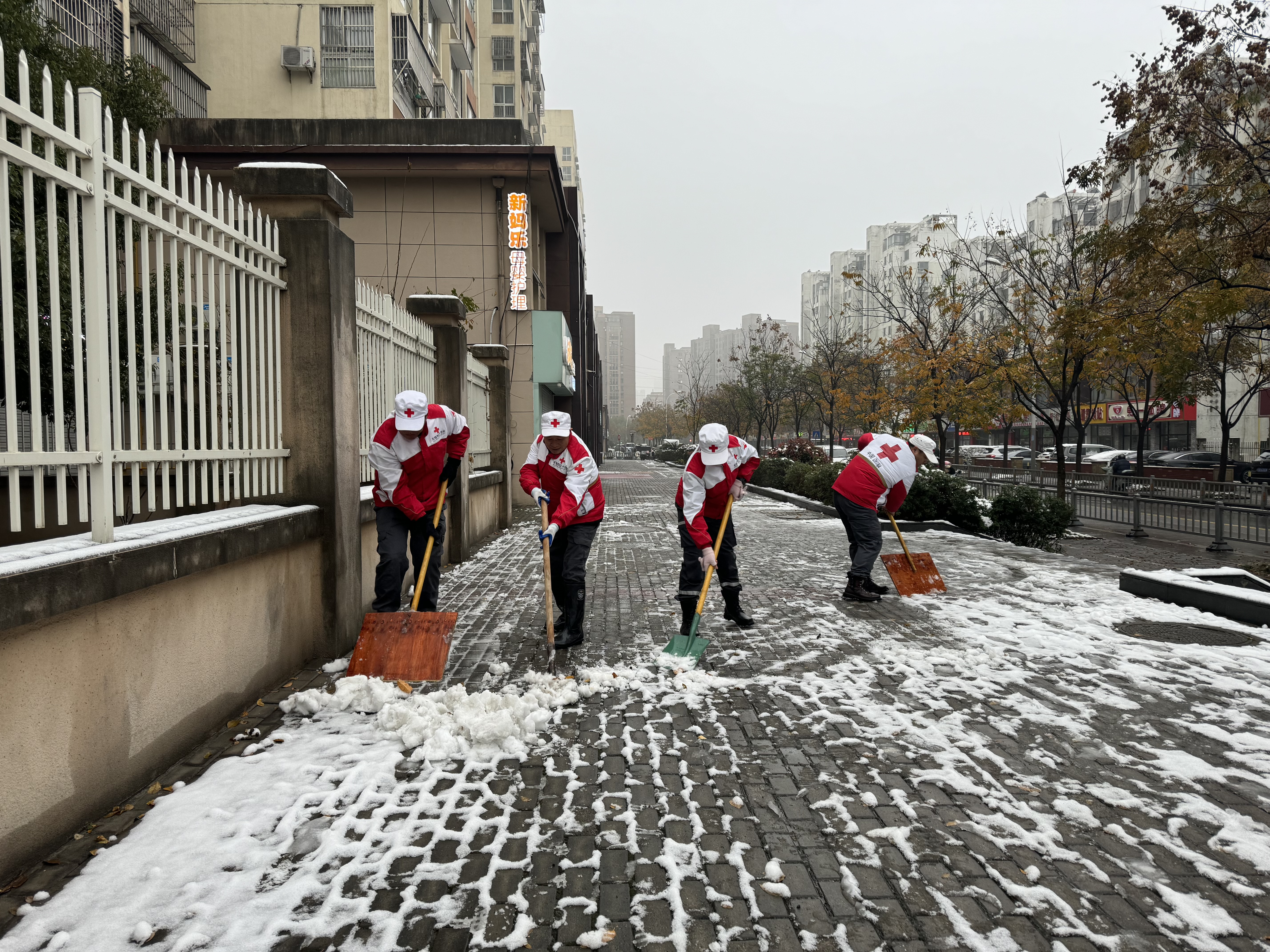 由于昨天的普降大雪,今早天气格外寒冷,道路多处结冰,路面非常湿滑,但队员们不畏严寒,干劲十足,以饱满的热情、昂扬的斗志积极投入到破冰除雪行动中。大家甩开膀子、撸起袖子,挥舞着清雪工具,两人一组,三人一伙,铲的铲、扫的扫、堆的堆,分工明确,配合默契,有序地清理了主次干道路、小区出入口、单元楼门口、停车场出入口、商家门前等地方的积雪,期间还不断提醒来往居民注意雪天路滑,确保出行安全。同时,队员们还会同社区工作人员对公共场所可能存在的安全隐患进行排查,提醒居民提高防范意识,注意防滑保暖,减少出行,那一抹抹红在白雪的映衬下显得分外耀眼。