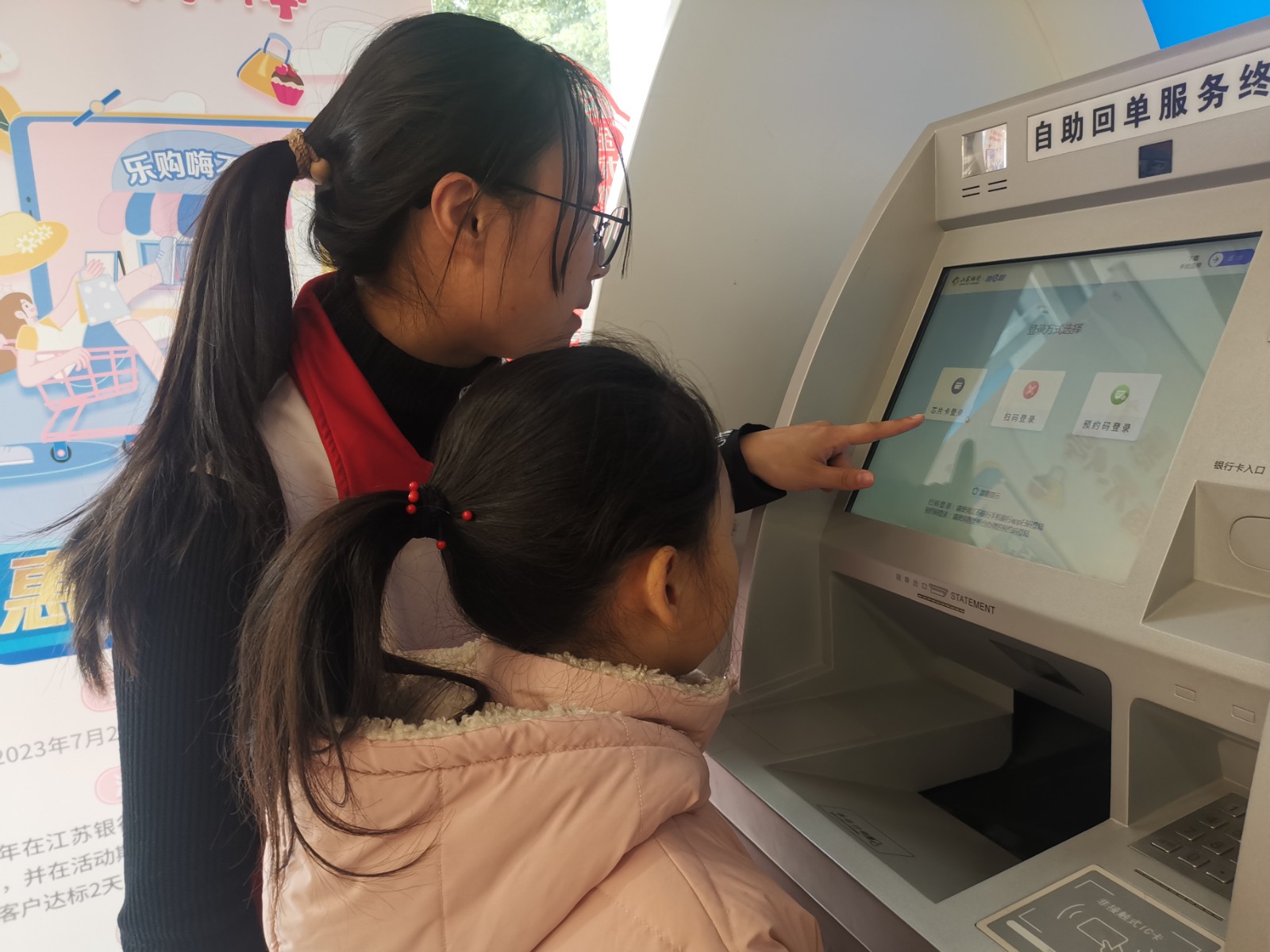 活动当天,江苏银行职教园支行的大堂经理带领小朋友们参观了营业大厅和各业务区域,体验了智能设备。孩子们兴趣浓厚,积极互动。参观结束后,工作人员又向小朋友们介绍了银行和钱币的相关知识,告诉他们,爸爸妈妈通过辛苦劳动才能获取报酬,所以不能乱用零花钱。同时,在组织模拟存取的互动环节中,工作人员让小朋友们体验了使用银行卡存取钱币的过程,活动现场气氛十分热烈。