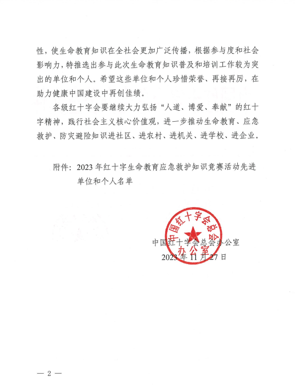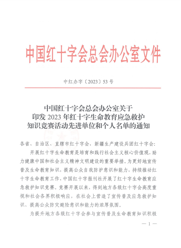 近日,中国红十字会总会办公室关于印发 2023 年红十字生命教育应急救护知识竞赛活动先进单位和个人名单的通知(中红办字【2023】53号),我市教育红会、唐洋中学荣获单位组织二等奖。
