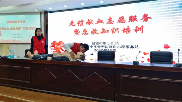 12月24日,市红十字应急救护师资队为市红十字会无偿献血志愿服务队60名队员开展救护培训。