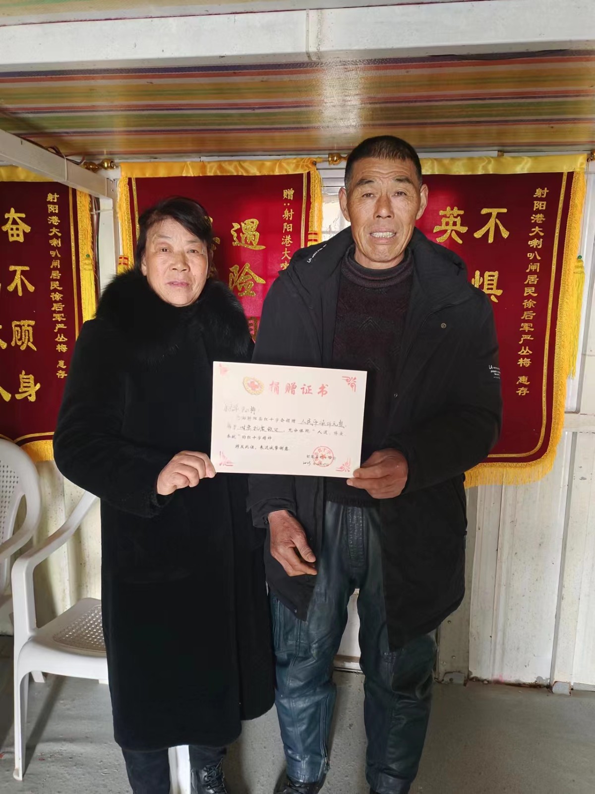 12月27日,射阳县红十字工作人员从徐后军夫妇手中接过捐赠款,感谢夫妻俩心系灾区、奉献爱心的善举。这笔善款将由省红十字会统一调配,用于抗震救灾工作。