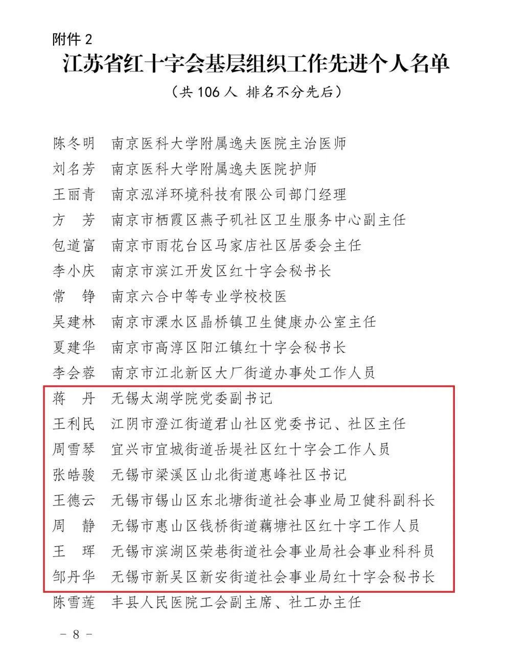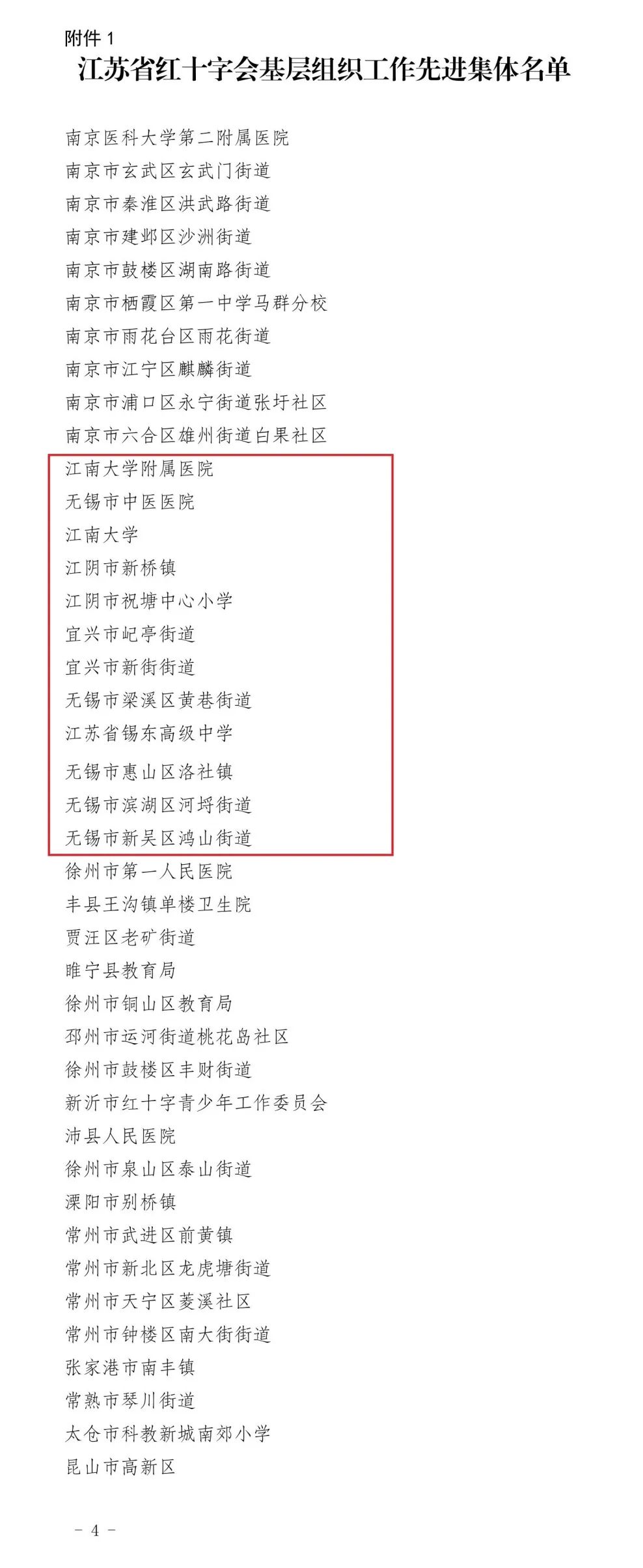 推动红十字基层组织向园区和“两新”阶层延伸拓展,全市累计建立基层红十字组织1747个,列全省首位。无锡江南大学附属医院等12家单位、蒋丹等8名个人分获“省红十字会基层组织工作先进集体和个人”称号。