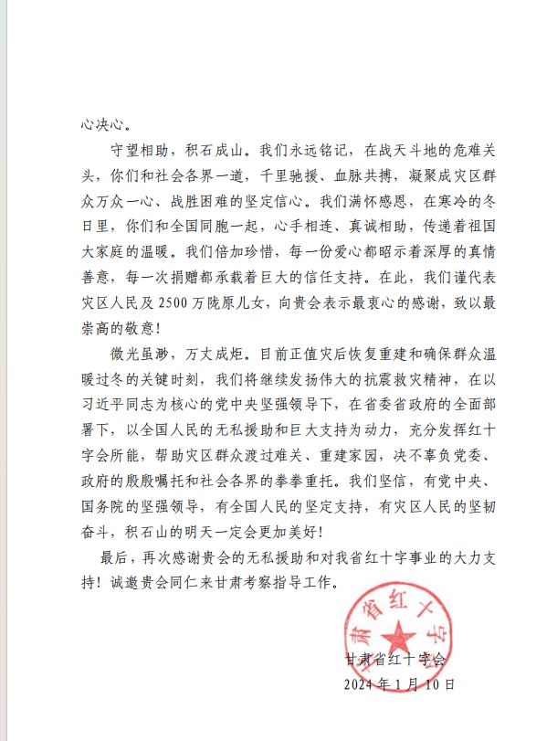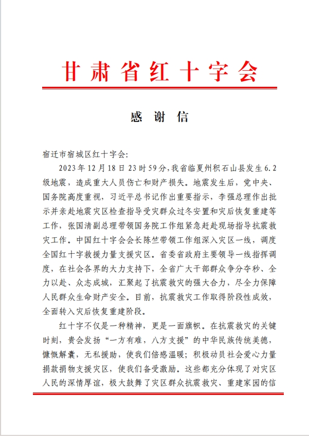 近日, 甘肃省红十字会向宿城区红十字会发来感谢信,感谢我会在甘肃省临夏州积石山县发生6.2地震时,积极动员辖区内爱心人士、爱心企业捐款捐物支援灾区。