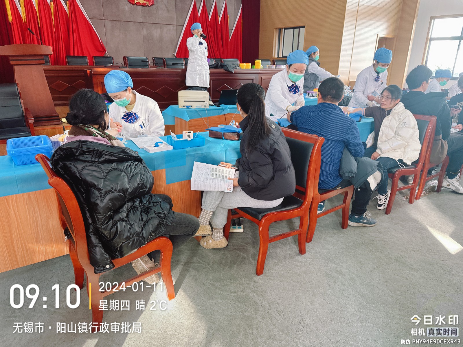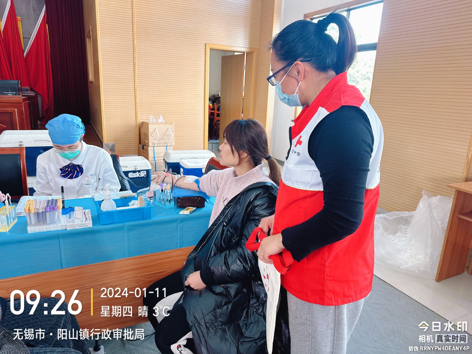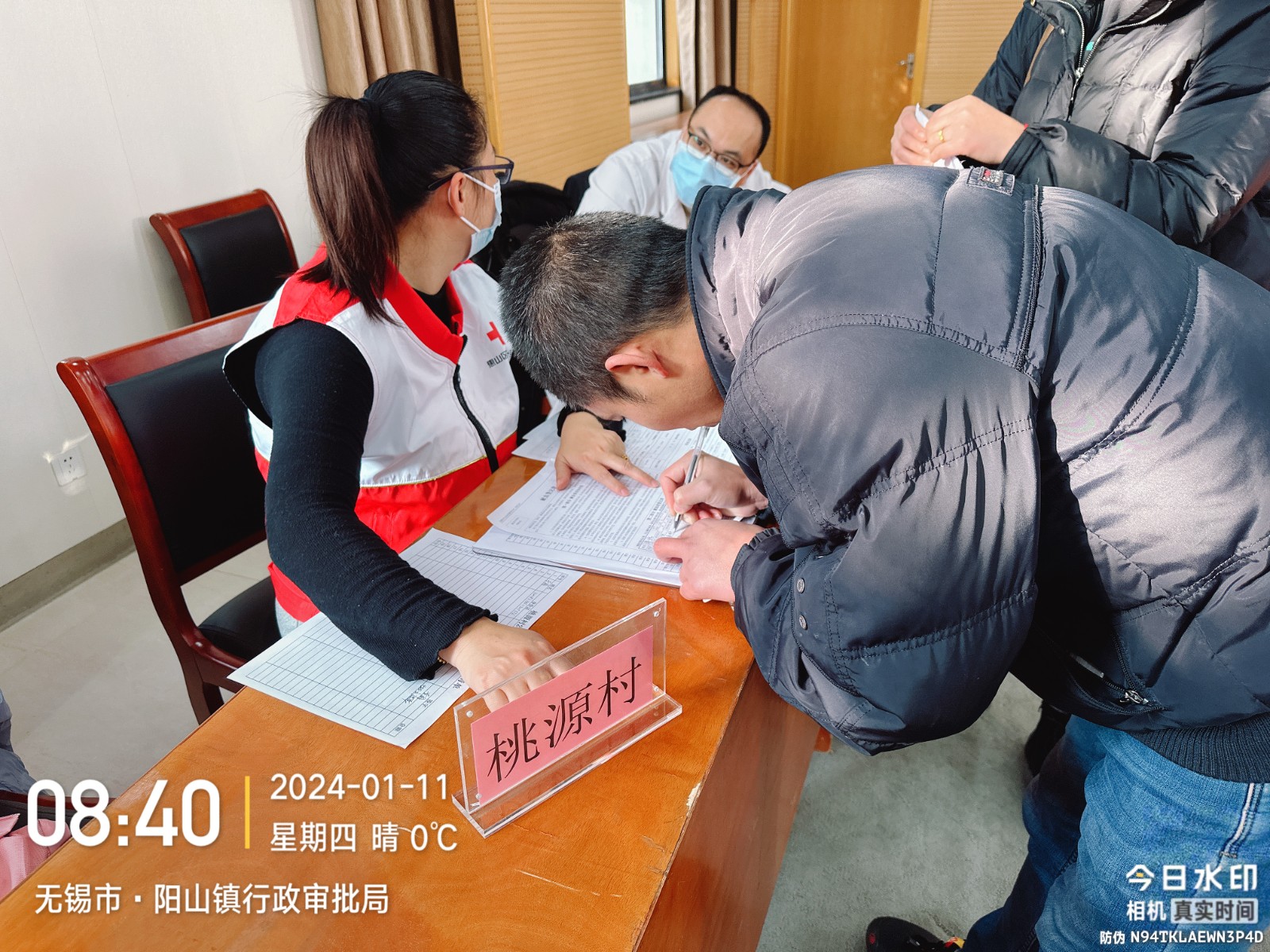 1月11日上午, 惠山区阳山镇桃源村红十字会本着“奉献、友爱、互助、进步”的志愿服务精神,组织志愿者们前往阳山镇政府3号楼二楼参与无偿献血活动。