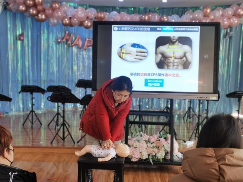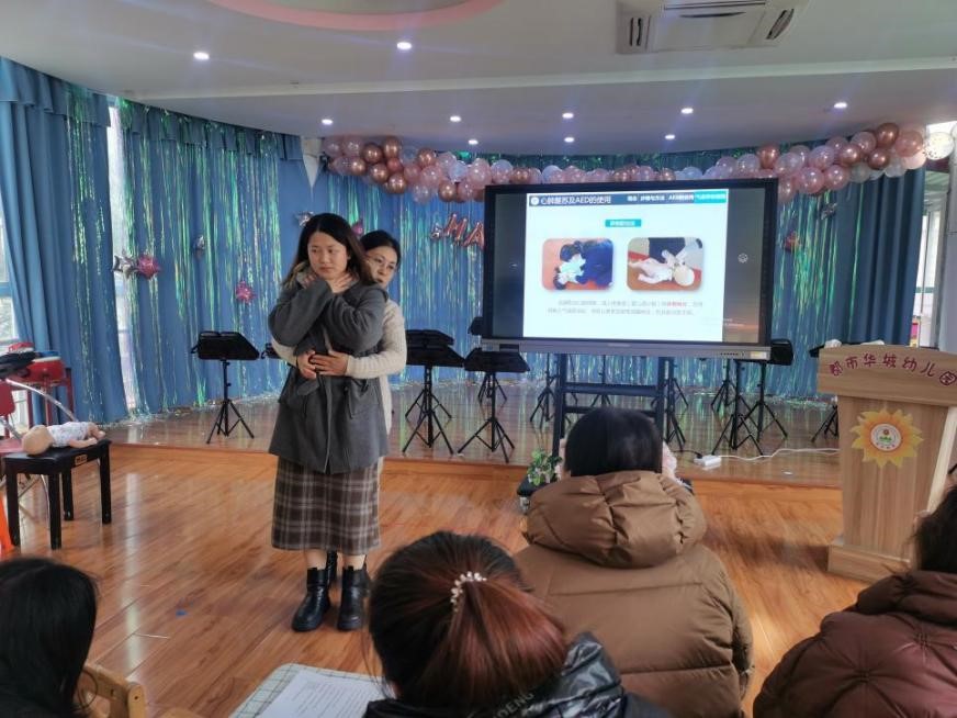 培训在春芽幼儿园、都市华城幼儿园、虹桥第三幼儿园等几个幼儿园分批次进行,内容结合幼儿教师日常工作,主要讲解了心肺复苏、海姆立克急救法、创伤救护等重点急救知识。老师的授课专业详实,幼儿教师们聚精会神学知识,边学边记。