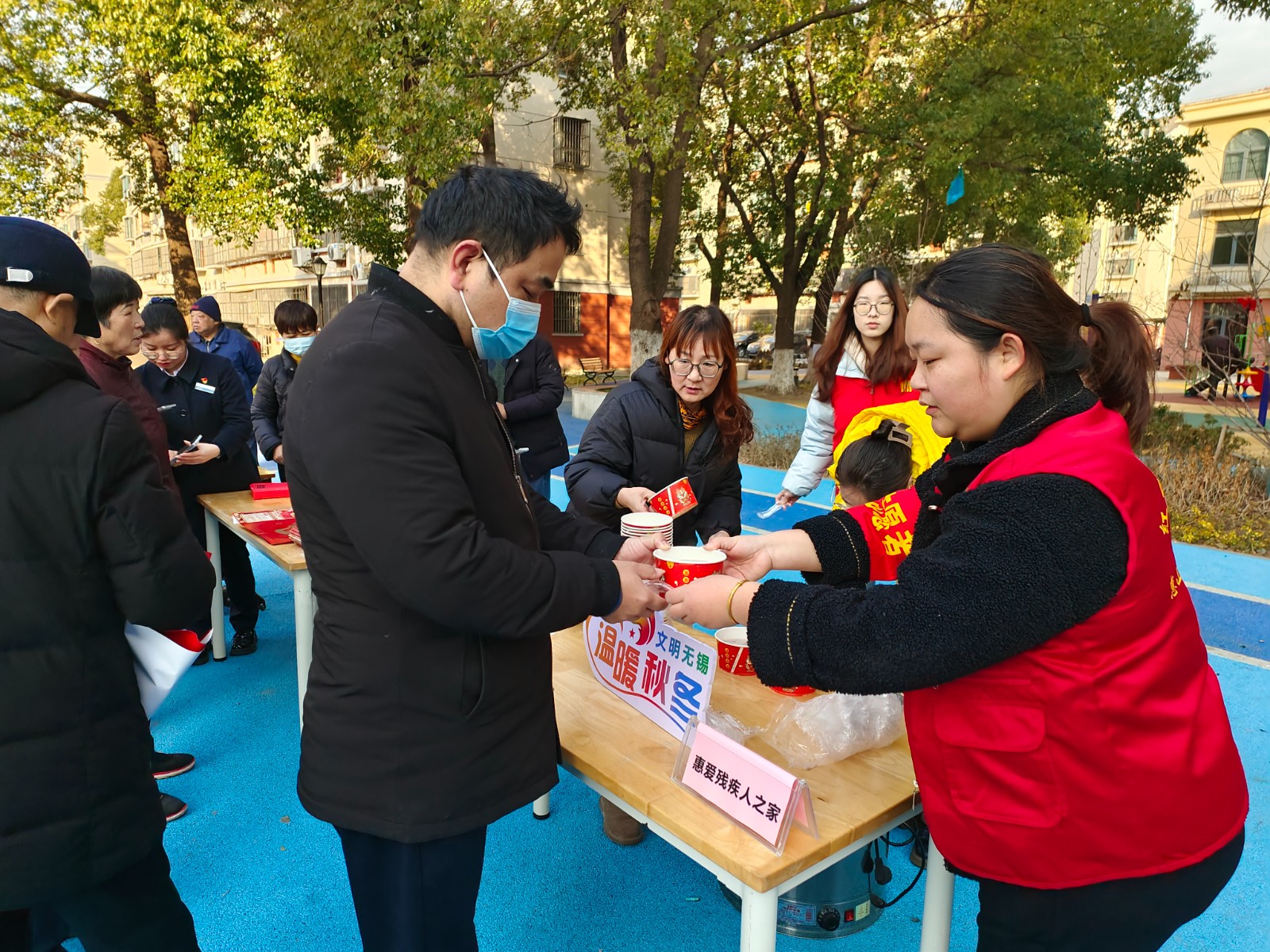 1月18日上午,惠山区堰桥街道金惠社区红十字会在社区旁小广场开展腊八传统文化志愿活动。志愿者们为辖区内重点帮扶对象、辖区内的孤寡老人上门送上一碗热腾腾的腊八粥,在这寒冷的冬天,喝上一碗热腾腾的腊八粥,让温暖融进居民的心里。香甜可口的腊八粥收到了居民的一致好评,大家奔走相告,社区居民、志愿者、工作人员都享受到了这场冬日的“暖宴”,让大家能够在寒冷的冬季感受到社区的温暖。