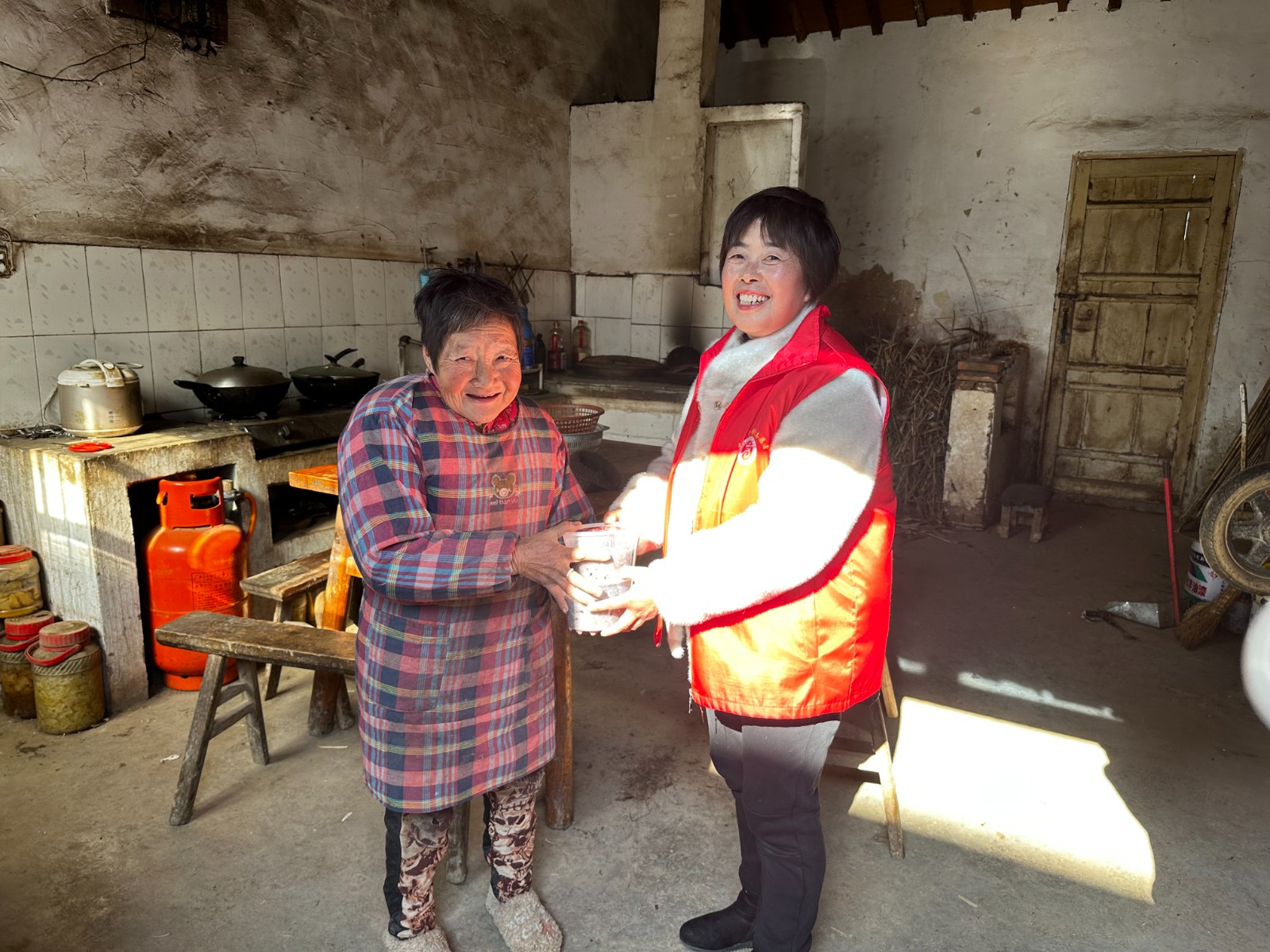 在93岁高龄的老复员军人吴善良家中,志愿者们送上新年祝福,祝愿万事“粥”全。老人很是感动。吴老表示:“过了腊八就是年,在新年来临之际,这份腊八粥承载着来自党和政府的关怀!谢谢你们。”