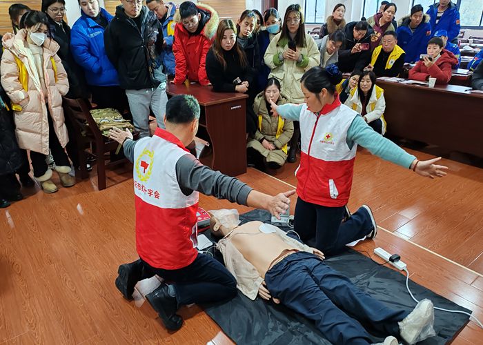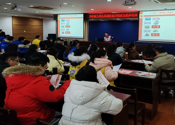 龙年伊始,为大力推进“关爱生命 救在身边”应急救护培训工作,持续推动应急救护知识进机关、进企业、进社区、进农村、进学校,着力打造“红十字救在身边”品牌工程。元月19日,丹阳市红十字会应急救护持证培训志愿服务走进界牌镇,为界牌镇政府职员、部分学校老师、企业员工及红十字志愿者开展应急救护持证培训,通过培训考核,共有68人获得红十字救护员证。