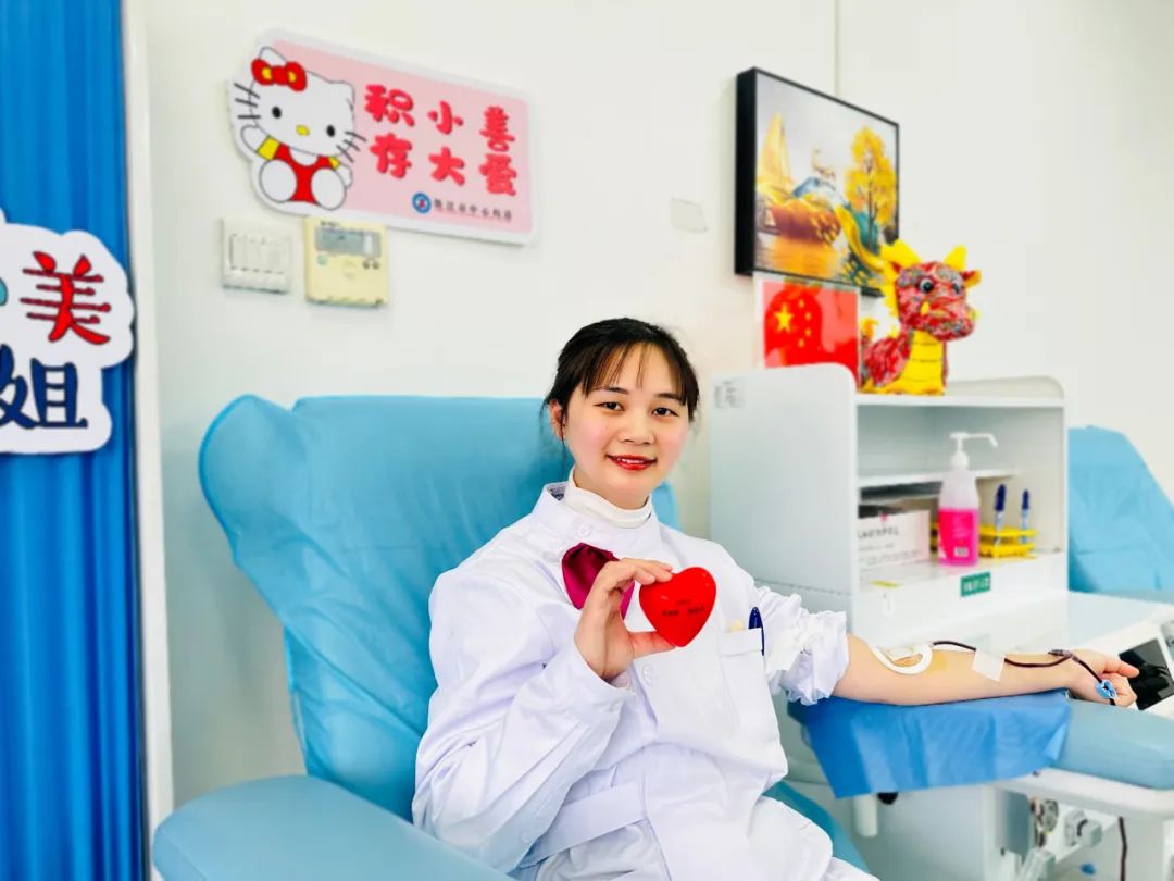 血站机采科护士郦天红利用工作间隙挽袖献血。2021年10月参加工作至今是第三次献血,总计已达900毫升。用自己的实际行动展示了“担当、热血、奉献”的血站精神风貌,向社会传递大爱无疆、无私奉献的红色正能量。